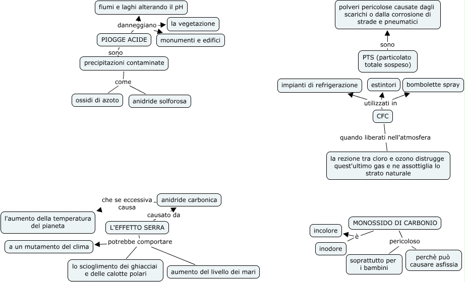 Questa Cmap, creata con IHMC CmapTools, contiene informazioni relative a: tecnologia ile, PIOGGE ACIDE sono precipitazioni contaminate, CFC quando liberati nell'atmosfera la rezione tra cloro e ozono distrugge quest'ultimo gas e ne assottiglia lo strato naturale, precipitazioni contaminate come ossidi di azoto, CFC utilizzati in impianti di refrigerazione, L'EFFETTO SERRA potrebbe comportare aumento del livello dei mari, MONOSSIDO DI CARBONIO pericoloso perchè può causare asfissia, MONOSSIDO DI CARBONIO è inodore, PIOGGE ACIDE danneggiano fiumi e laghi alterando il pH, CFC utilizzati in bombolette spray, precipitazioni contaminate come anidride solforosa, L'EFFETTO SERRA potrebbe comportare lo scioglimento dei ghiacciai e delle calotte polari, CFC utilizzati in estintori, PIOGGE ACIDE danneggiano monumenti e edifici, MONOSSIDO DI CARBONIO pericoloso soprattutto per i bambini, PIOGGE ACIDE danneggiano la vegetazione, MONOSSIDO DI CARBONIO è incolore, anidride carbonica che se eccessiva causa l'aumento della temperatura del pianeta, PTS (particolato totale sospeso) sono polveri pericolose causate dagli scarichi o dalla corrosione di strade e pneumatici, L'EFFETTO SERRA potrebbe comportare a un mutamento del clima, L'EFFETTO SERRA causato da anidride carbonica