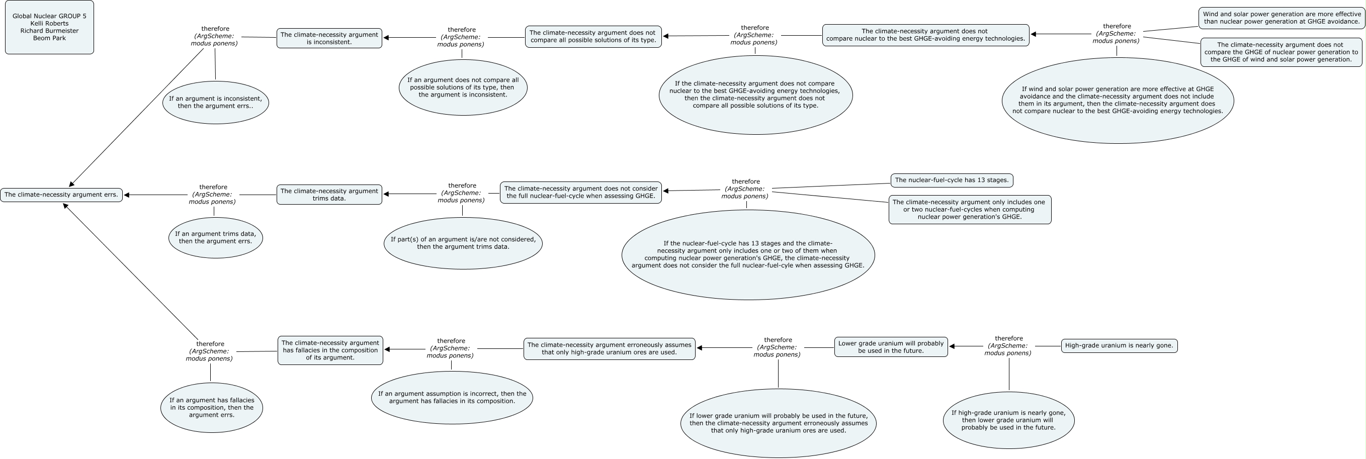 This Concept Map, created with IHMC CmapTools, has information related to: Kelli Roberts 4.1.b, If lower grade uranium will probably be used in the future, then the climate-necessity argument erroneously assumes that only high-grade uranium ores are used. therefore (ArgScheme: modus ponens) The climate-necessity argument erroneously assumes that only high-grade uranium ores are used., If an argument is inconsistent, then the argument errs.. therefore (ArgScheme: modus ponens) The climate-necessity argument errs., The nuclear-fuel-cycle has 13 stages. therefore (ArgScheme: modus ponens) The climate-necessity argument does not consider the full nuclear-fuel-cycle when assessing GHGE., If an argument has fallacies in its composition, then the argument errs. therefore (ArgScheme: modus ponens) The climate-necessity argument errs., If part(s) of an argument is/are not considered, then the argument trims data. therefore (ArgScheme: modus ponens) The climate-necessity argument trims data., The climate-necessity argument erroneously assumes that only high-grade uranium ores are used. therefore (ArgScheme: modus ponens) The climate-necessity argument has fallacies in the composition of its argument., If an argument trims data, then the argument errs. therefore (ArgScheme: modus ponens) The climate-necessity argument errs., If the nuclear-fuel-cycle has 13 stages and the climate- necessity argument only includes one or two of them when computing nuclear power generation's GHGE, the climate-necessity argument does not consider the full nuclear-fuel-cyle when assessing GHGE. therefore (ArgScheme: modus ponens) The climate-necessity argument does not consider the full nuclear-fuel-cycle when assessing GHGE., Wind and solar power generation are more effective than nuclear power generation at GHGE avoidance. therefore (ArgScheme: modus ponens) The climate-necessity argument does not compare nuclear to the best GHGE-avoiding energy technologies., The climate-necessity argument is inconsistent. therefore (ArgScheme: modus ponens) The climate-necessity argument errs., The climate-necessity argument trims data. therefore (ArgScheme: modus ponens) The climate-necessity argument errs., If high-grade uranium is nearly gone, then lower grade uranium will probably be used in the future. therefore (ArgScheme: modus ponens) Lower grade uranium will probably be used in the future., If an argument does not compare all possible solutions of its type, then the argument is inconsistent. therefore (ArgScheme: modus ponens) The climate-necessity argument is inconsistent., The climate-necessity argument does not compare nuclear to the best GHGE-avoiding energy technologies. therefore (ArgScheme: modus ponens) The climate-necessity argument does not compare all possible solutions of its type., If the nuclear-fuel-cycle has 13 stages and the climate- necessity argument only includes one or two of them when computing nuclear power generation's GHGE, the climate-necessity argument does not consider the full nuclear-fuel-cyle when assessing GHGE. therefore (ArgScheme: modus ponens) The climate-necessity argument only includes one or two nuclear-fuel-cycles when computing nuclear power generation's GHGE., If the climate-necessity argument does not compare nuclear to the best GHGE-avoiding energy technologies, then the climate-necessity argument does not compare all possible solutions of its type. therefore (ArgScheme: modus ponens) The climate-necessity argument does not compare all possible solutions of its type., The climate-necessity argument does not compare the GHGE of nuclear power generation to the GHGE of wind and solar power generation. therefore (ArgScheme: modus ponens) The climate-necessity argument does not compare nuclear to the best GHGE-avoiding energy technologies., If an argument assumption is incorrect, then the argument has fallacies in its composition. therefore (ArgScheme: modus ponens) The climate-necessity argument has fallacies in the composition of its argument., High-grade uranium is nearly gone. therefore (ArgScheme: modus ponens) Lower grade uranium will probably be used in the future., The nuclear-fuel-cycle has 13 stages. therefore (ArgScheme: modus ponens) The climate-necessity argument only includes one or two nuclear-fuel-cycles when computing nuclear power generation's GHGE.