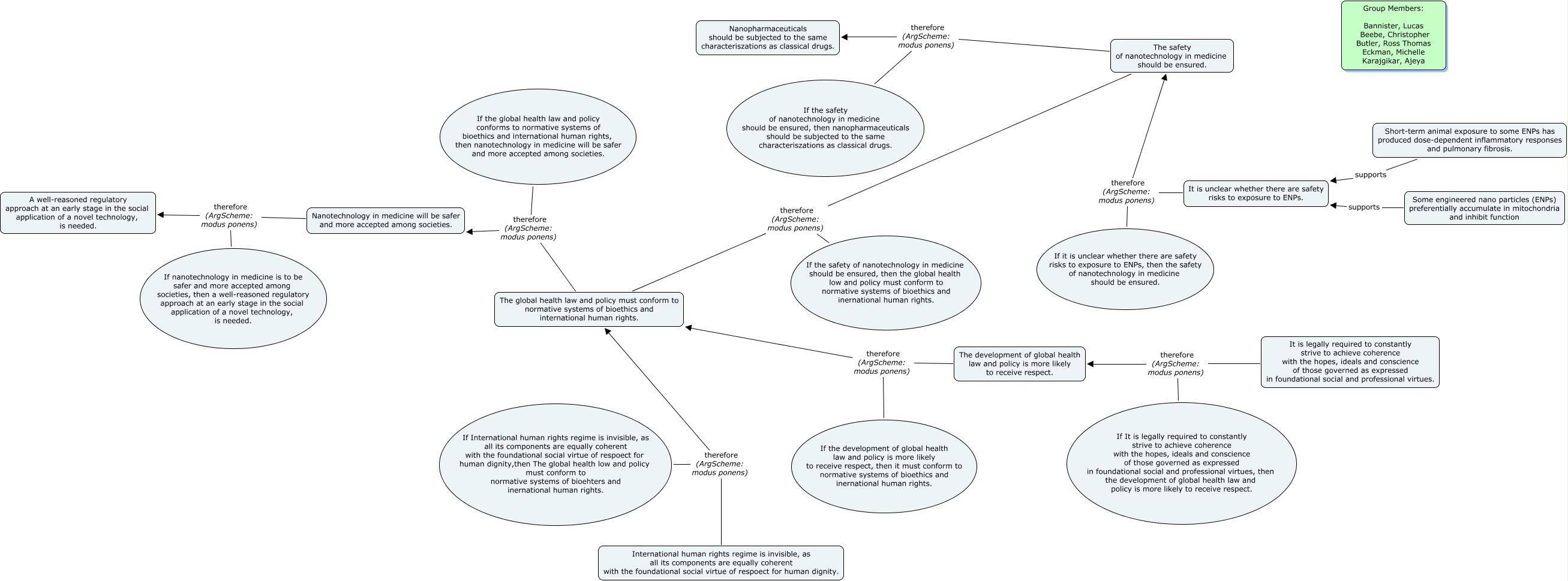 This Concept Map, created with IHMC CmapTools, has information related to: Nanotechnology in Medicine Group 1, The development of global health law and policy is more likely to receive respect. therefore (ArgScheme: modus ponens) The global health law and policy must conform to normative systems of bioethics and international human rights., Nanotechnology in medicine will be safer and more accepted among societies. therefore (ArgScheme: modus ponens) A well-reasoned regulatory approach at an early stage in the social application of a novel technology, is needed., It is legally required to constantly strive to achieve coherence with the hopes, ideals and conscience of those governed as expressed in foundational social and professional virtues. therefore (ArgScheme: modus ponens) The development of global health law and policy is more likely to receive respect., If it is unclear whether there are safety risks to exposure to ENPs, then the safety of nanotechnology in medicine should be ensured. therefore (ArgScheme: modus ponens) The safety of nanotechnology in medicine should be ensured., If the development of global health law and policy is more likely to receive respect, then it must conform to normative systems of bioethics and inernational human rights. therefore (ArgScheme: modus ponens) The global health law and policy must conform to normative systems of bioethics and international human rights., If nanotechnology in medicine is to be safer and more accepted among societies, then a well-reasoned regulatory approach at an early stage in the social application of a novel technology, is needed. therefore (ArgScheme: modus ponens) A well-reasoned regulatory approach at an early stage in the social application of a novel technology, is needed., The safety of nanotechnology in medicine should be ensured. therefore (ArgScheme: modus ponens) The global health law and policy must conform to normative systems of bioethics and international human rights., International human rights regime is invisible, as all its components are equally coherent with the foundational social virtue of respoect for human dignity. therefore (ArgScheme: modus ponens) The global health law and policy must conform to normative systems of bioethics and international human rights., Some engineered nano particles (ENPs) preferentially accumulate in mitochondria and inhibit function supports It is unclear whether there are safety risks to exposure to ENPs., If the safety of nanotechnology in medicine should be ensured, then the global health low and policy must conform to normative systems of bioethics and inernational human rights. therefore (ArgScheme: modus ponens) The global health law and policy must conform to normative systems of bioethics and international human rights., Short-term animal exposure to some ENPs has produced dose-dependent inflammatory responses and pulmonary fibrosis. supports It is unclear whether there are safety risks to exposure to ENPs., It is unclear whether there are safety risks to exposure to ENPs. therefore (ArgScheme: modus ponens) The safety of nanotechnology in medicine should be ensured., If the safety of nanotechnology in medicine should be ensured, then nanopharmaceuticals should be subjected to the same characteriszations as classical drugs. therefore (ArgScheme: modus ponens) Nanopharmaceuticals should be subjected to the same characteriszations as classical drugs., The global health law and policy must conform to normative systems of bioethics and international human rights. therefore (ArgScheme: modus ponens) Nanotechnology in medicine will be safer and more accepted among societies., If It is legally required to constantly strive to achieve coherence with the hopes, ideals and conscience of those governed as expressed in foundational social and professional virtues, then the development of global health law and policy is more likely to receive respect. therefore (ArgScheme: modus ponens) The development of global health law and policy is more likely to receive respect., The safety of nanotechnology in medicine should be ensured. therefore (ArgScheme: modus ponens) Nanopharmaceuticals should be subjected to the same characteriszations as classical drugs., If International human rights regime is invisible, as all its components are equally coherent with the foundational social virtue of respoect for human dignity,then The global health low and policy must conform to normative systems of bioehters and inernational human rights. therefore (ArgScheme: modus ponens) The global health law and policy must conform to normative systems of bioethics and international human rights., If the global health law and policy conforms to normative systems of bioethics and international human rights, then nanotechnology in medicine will be safer and more accepted among societies. therefore (ArgScheme: modus ponens) Nanotechnology in medicine will be safer and more accepted among societies.
