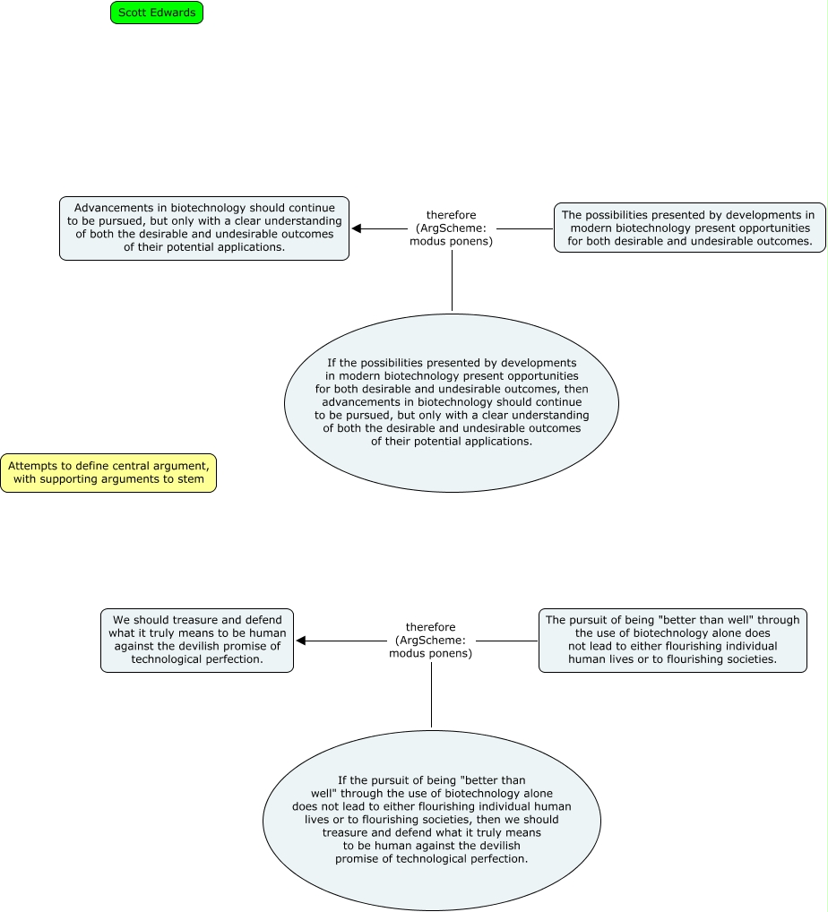 This Concept Map, created with IHMC CmapTools, has information related to: Biotech and pursuit of perfection_rough draft 1, The possibilities presented by developments in modern biotechnology present opportunities for both desirable and undesirable outcomes. therefore (ArgScheme: modus ponens) Advancements in biotechnology should continue to be pursued, but only with a clear understanding of both the desirable and undesirable outcomes of their potential applications., The pursuit of being "better than well" through the use of biotechnology alone does not lead to either flourishing individual human lives or to flourishing societies. therefore (ArgScheme: modus ponens) We should treasure and defend what it truly means to be human against the devilish promise of technological perfection., If the possibilities presented by developments in modern biotechnology present opportunities for both desirable and undesirable outcomes, then advancements in biotechnology should continue to be pursued, but only with a clear understanding of both the desirable and undesirable outcomes of their potential applications. therefore (ArgScheme: modus ponens) Advancements in biotechnology should continue to be pursued, but only with a clear understanding of both the desirable and undesirable outcomes of their potential applications., If the pursuit of being "better than well" through the use of biotechnology alone does not lead to either flourishing individual human lives or to flourishing societies, then we should treasure and defend what it truly means to be human against the devilish promise of technological perfection. therefore (ArgScheme: modus ponens) We should treasure and defend what it truly means to be human against the devilish promise of technological perfection.