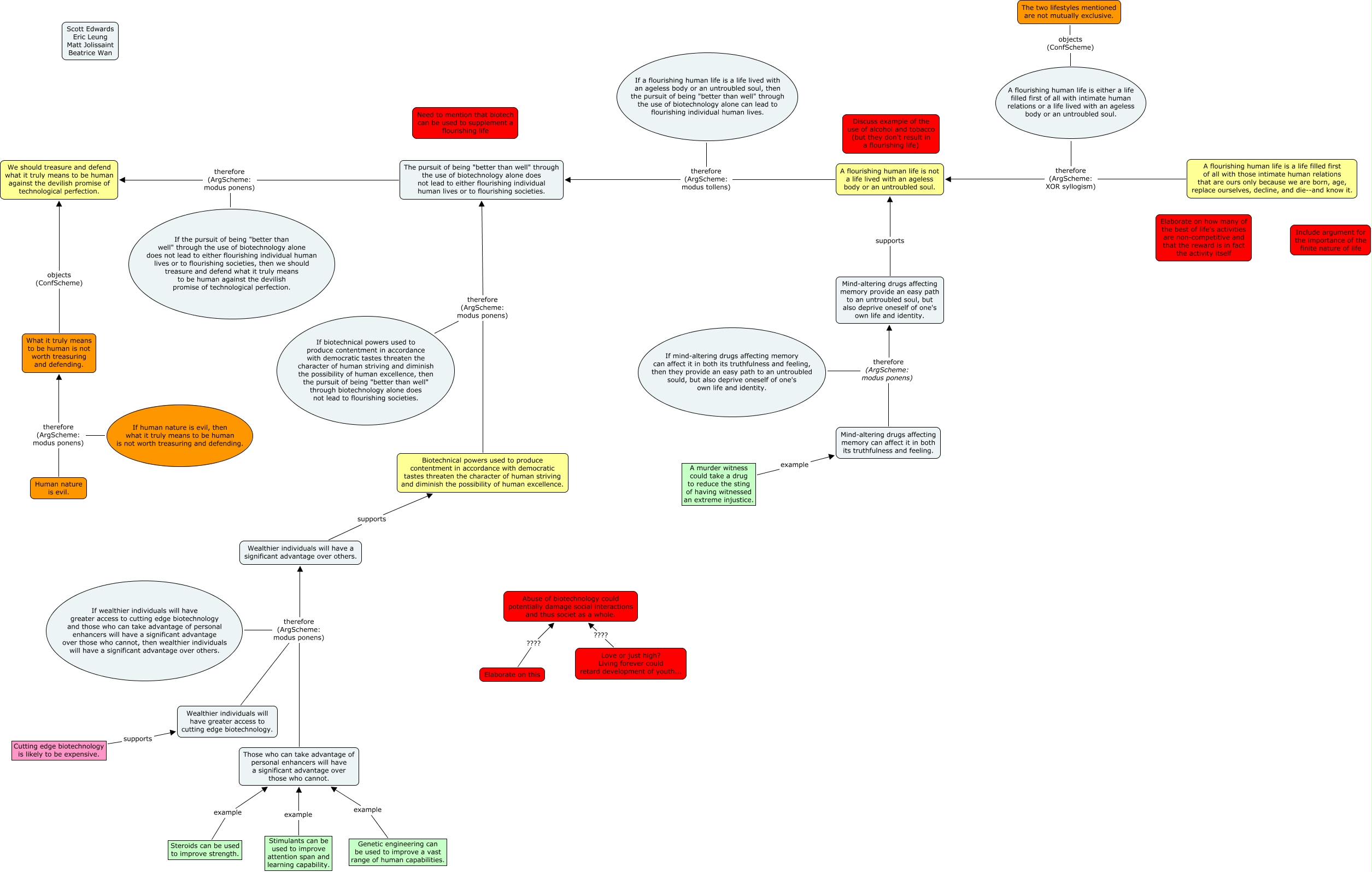 This Concept Map, created with IHMC CmapTools, has information related to: Rough Draft 1.4, Mind-altering drugs affecting memory provide an easy path to an untroubled soul, but also deprive oneself of one's own life and identity. supports A flourishing human life is not a life lived with an ageless body or an untroubled soul., The two lifestyles mentioned are not mutually exclusive. objects (ConfScheme) A flourishing human life is either a life filled first of all with intimate human relations or a life lived with an ageless body or an untroubled soul., Cutting edge biotechnology is likely to be expensive. supports Wealthier individuals will have greater access to cutting edge biotechnology., Mind-altering drugs affecting memory can affect it in both its truthfulness and feeling. therefore (ArgScheme: modus ponens) Mind-altering drugs affecting memory provide an easy path to an untroubled soul, but also deprive oneself of one's own life and identity., If the pursuit of being "better than well" through the use of biotechnology alone does not lead to either flourishing individual human lives or to flourishing societies, then we should treasure and defend what it truly means to be human against the devilish promise of technological perfection. therefore (ArgScheme: modus ponens) We should treasure and defend what it truly means to be human against the devilish promise of technological perfection., Biotechnical powers used to produce contentment in accordance with democratic tastes threaten the character of human striving and diminish the possibility of human excellence. therefore (ArgScheme: modus ponens) The pursuit of being "better than well" through the use of biotechnology alone does not lead to either flourishing individual human lives or to flourishing societies., If wealthier individuals will have greater access to cutting edge biotechnology and those who can take advantage of personal enhancers will have a significant advantage over those who cannot, then wealthier individuals will have a significant advantage over others. therefore (ArgScheme: modus ponens) Wealthier individuals will have a significant advantage over others., What it truly means to be human is not worth treasuring and defending. objects (ConfScheme) We should treasure and defend what it truly means to be human against the devilish promise of technological perfection., A flourishing human life is either a life filled first of all with intimate human relations or a life lived with an ageless body or an untroubled soul. therefore (ArgScheme: XOR syllogism) A flourishing human life is not a life lived with an ageless body or an untroubled soul., Love or just high? Living forever could retard development of youth... ???? Abuse of biotechnology could potentially damage social interactions and thus societ as a whole., Steroids can be used to improve strength. example Those who can take advantage of personal enhancers will have a significant advantage over those who cannot., Human nature is evil. therefore (ArgScheme: modus ponens) What it truly means to be human is not worth treasuring and defending., The pursuit of being "better than well" through the use of biotechnology alone does not lead to either flourishing individual human lives or to flourishing societies. therefore (ArgScheme: modus ponens) We should treasure and defend what it truly means to be human against the devilish promise of technological perfection., Those who can take advantage of personal enhancers will have a significant advantage over those who cannot. therefore (ArgScheme: modus ponens) Wealthier individuals will have a significant advantage over others., Wealthier individuals will have greater access to cutting edge biotechnology. therefore (ArgScheme: modus ponens) Wealthier individuals will have a significant advantage over others., If biotechnical powers used to produce contentment in accordance with democratic tastes threaten the character of human striving and diminish the possibility of human excellence, then the pursuit of being "better than well" through biotechnology alone does not lead to flourishing societies. therefore (ArgScheme: modus ponens) The pursuit of being "better than well" through the use of biotechnology alone does not lead to either flourishing individual human lives or to flourishing societies., If mind-altering drugs affecting memory can affect it in both its truthfulness and feeling, then they provide an easy path to an untroubled sould, but also deprive oneself of one's own life and identity. therefore (ArgScheme: modus ponens) Mind-altering drugs affecting memory provide an easy path to an untroubled soul, but also deprive oneself of one's own life and identity., A murder witness could take a drug to reduce the sting of having witnessed an extreme injustice. example Mind-altering drugs affecting memory can affect it in both its truthfulness and feeling., Elaborate on this ???? Abuse of biotechnology could potentially damage social interactions and thus societ as a whole., A flourishing human life is not a life lived with an ageless body or an untroubled soul. therefore (ArgScheme: modus tollens) The pursuit of being "better than well" through the use of biotechnology alone does not lead to either flourishing individual human lives or to flourishing societies.