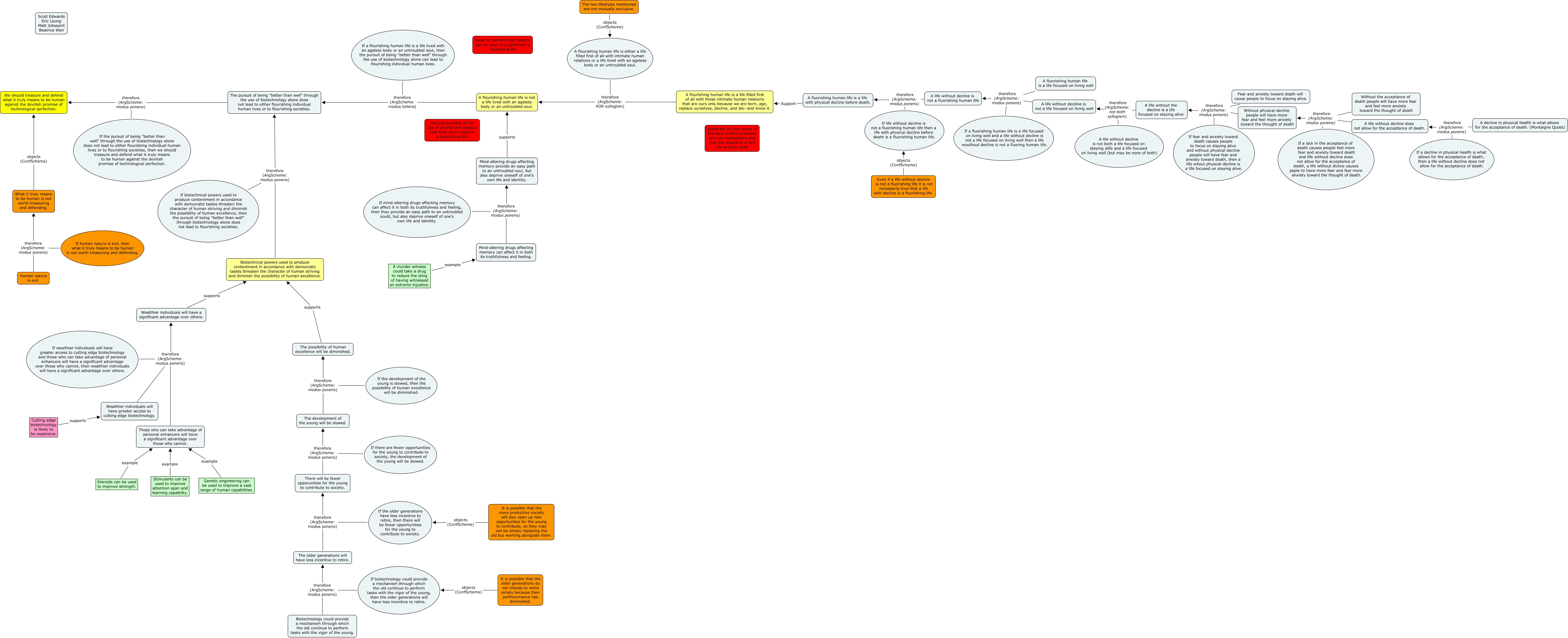 This Concept Map, created with IHMC CmapTools, has information related to: Rough Draft 1.6, Biotechnical powers used to produce contentment in accordance with democratic tastes threaten the character of human striving and diminish the possibility of human excellence. therefore (ArgScheme: modus ponens) The pursuit of being "better than well" through the use of biotechnology alone does not lead to either flourishing individual human lives or to flourishing societies., If wealthier individuals will have greater access to cutting edge biotechnology and those who can take advantage of personal enhancers will have a significant advantage over those who cannot, then wealthier individuals will have a significant advantage over others. therefore (ArgScheme: modus ponens) Wealthier individuals will have a significant advantage over others., Without physical decline people will have more fear and feel more anxiety toward the thought of death therefore (ArgScheme: modus ponens) A life without the decline is a life focused on staying alive, It is possible that the more productive society will also open up new opportunites for the young to contribute, so they may not be simply replacing the old but working alongside them. objects (ConfScheme) If the older generations have less incentive to retire, then there will be fewer opportunities for the young to contribute to society., If a fluorishing human life is a life focused on living well and a life without decline is not a life focused on living well then a life wouthout decline is not a fluoring human life. therefore (ArgScheme: modus ponens) A life without decline is not a fluorishing human life, Wealthier individuals will have a significant advantage over others. supports Biotechnical powers used to produce contentment in accordance with democratic tastes threaten the character of human striving and diminish the possibility of human excellence., Wealthier individuals will have greater access to cutting edge biotechnology. therefore (ArgScheme: modus ponens) Wealthier individuals will have a significant advantage over others., Without the acceptance of death people will have more fear and feel more anxiety toward the thought of death therefore (ArgScheme: modus ponens) Without physical decline people will have more fear and feel more anxiety toward the thought of death, If fear and anxiety toward death causes people to focus on staying alive and without physical decline people will have fear and anxiety toward death, then a life witout physical decline is a life focused on staying alive. therefore (ArgScheme: modus ponens) A life without the decline is a life focused on staying alive, Stimulants can be used to improve attention span and learning capability. example Those who can take advantage of personal enhancers will have a significant advantage over those who cannot., The older generations will have less incentive to retire. therefore (ArgScheme: modus ponens) There will be fewer opporunities for the young to contribute to society., If a decline in physical health is what allows for the acceptance of death, then a life without decline does not allow for the acceptance of death. therefore (ArgScheme: modus ponens) A life without decline does not allow for the acceptance of death., There will be fewer opporunities for the young to contribute to society. therefore (ArgScheme: modus ponens) The development of the young will be slowed., A decline in physical health is what allows for the acceptance of death. (Montaigne Quote) therefore (ArgScheme: modus ponens) A life without decline does not allow for the acceptance of death., Mind-altering drugs affecting memory can affect it in both its truthfulness and feeling. therefore (ArgScheme: modus ponens) Mind-altering drugs affecting memory provide an easy path to an untroubled soul, but also deprive oneself of one's own life and identity., The two lifestyles mentioned are not mutually exclusive. objects (ConfScheme) A flourishing human life is either a life filled first of all with intimate human relations or a life lived with an ageless body or an untroubled soul., Steroids can be used to improve strength. example Those who can take advantage of personal enhancers will have a significant advantage over those who cannot., It is possible that the older generations do not choose to retire simply because their perfmormance has diminished. objects (ConfScheme) If biotechnology could provide a mechanism through which the old continue to perform tasks with the vigor of the young, then the older generations will have less incentive to retire., A life without decline is not both a life focused on staying alife and a life focused on living well (but may be none of both) therefore (ArgScheme: not-both syllogism) A life without deciline is not a life focused on living well, If biotechnology could provide a mechanism through which the old continue to perform tasks with the vigor of the young, then the older generations will have less incentive to retire. therefore (ArgScheme: modus ponens) The older generations will have less incentive to retire.