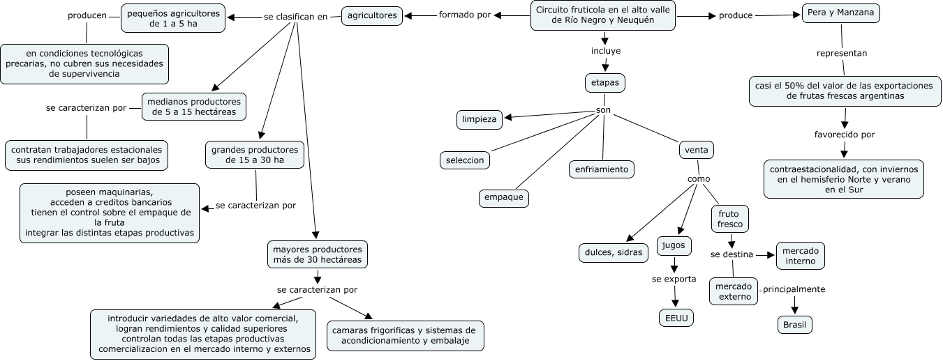 Este Cmap, tiene información relacionada con: matias villalba agricultura, fruto fresco se destina mercado externo, etapas son empaque, agricultores se clasifican en grandes productores de 15 a 30 ha, casi el 50% del valor de las exportaciones de frutas frescas argentinas favorecido por contraestacionalidad, con inviernos en el hemisferio Norte y verano en el Sur, medianos productores de 5 a 15 hectáreas se caracterizan por contratan trabajadores estacionales sus rendimientos suelen ser bajos, agricultores se clasifican en medianos productores de 5 a 15 hectáreas, mayores productores más de 30 hectáreas se caracterizan por camaras frigorificas y sistemas de acondicionamiento y embalaje, venta como jugos, etapas son venta, Pera y Manzana representan casi el 50% del valor de las exportaciones de frutas frescas argentinas, pequeños agricultores de 1 a 5 ha producen en condiciones tecnológicas precarias, no cubren sus necesidades de supervivencia, agricultores se clasifican en mayores productores más de 30 hectáreas, Circuito fruticola en el alto valle de Río Negro y Neuquén produce Pera y Manzana, Circuito fruticola en el alto valle de Río Negro y Neuquén incluye etapas, venta como fruto fresco, agricultores se clasifican en pequeños agricultores de 1 a 5 ha, jugos se exporta EEUU, fruto fresco se destina mercado interno, mayores productores más de 30 hectáreas se caracterizan por introducir variedades de alto valor comercial, logran rendimientos y calidad superiores controlan todas las etapas productivas comercializacion en el mercado interno y externos, etapas son enfriamiento