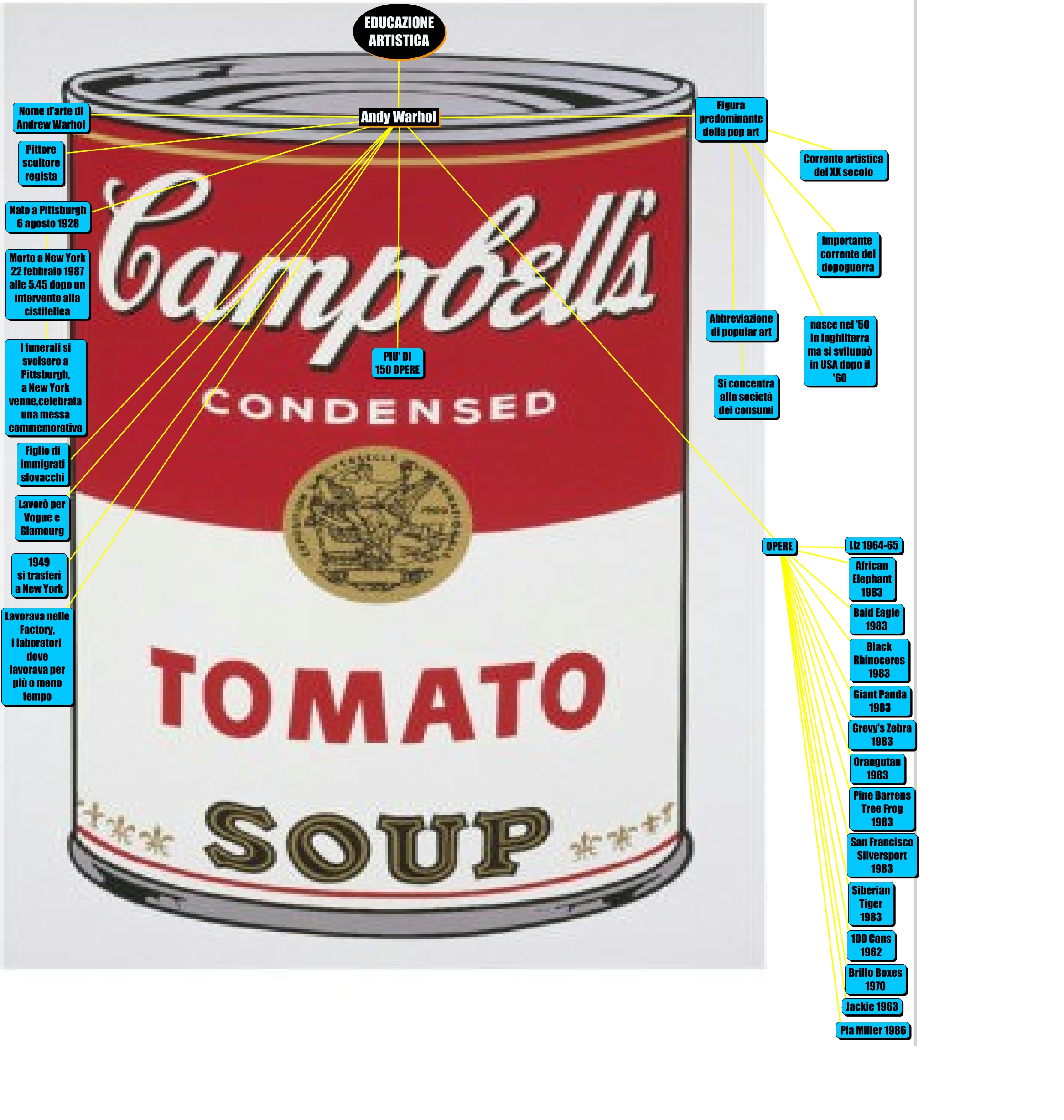 Questa Cmap, creata con IHMC CmapTools, contiene informazioni relative a: mappa esame ed. artistica emil, OPERE ???? Orangutan 1983, Nato a Pittsburgh 6 agosto 1928 ???? Morto a New York 22 febbraio 1987 alle 5.45 dopo un intervento alla cistifellea, Figura predominante della pop art ???? nasce nel '50 in Inghilterra ma si sviluppò in USA dopo il '60, Andy Warhol ???? Pittore scultore regista, Andy Warhol ???? Nato a Pittsburgh 6 agosto 1928, OPERE ???? Pia Miller 1986, OPERE ???? 100 Cans 1962, Andy Warhol ???? Figlio di immigrati slovacchi, OPERE ???? Brillo Boxes 1970, OPERE ???? Giant Panda 1983, OPERE ???? Pine Barrens Tree Frog 1983, OPERE ???? Siberian Tiger 1983, OPERE ???? San Francisco Silversport 1983, OPERE ???? Grevy's Zebra 1983, OPERE ???? Jackie 1963, Figura predominante della pop art ???? Corrente artistica del XX secolo, Andy Warhol ???? Lavorava nelle Factory, i laboratori dove lavorava per più o meno tempo, Figura predominante della pop art ???? Abbreviazione di popular art, Andy Warhol ???? Figura predominante della pop art, Andy Warhol ???? 1949 si trasferì a New York