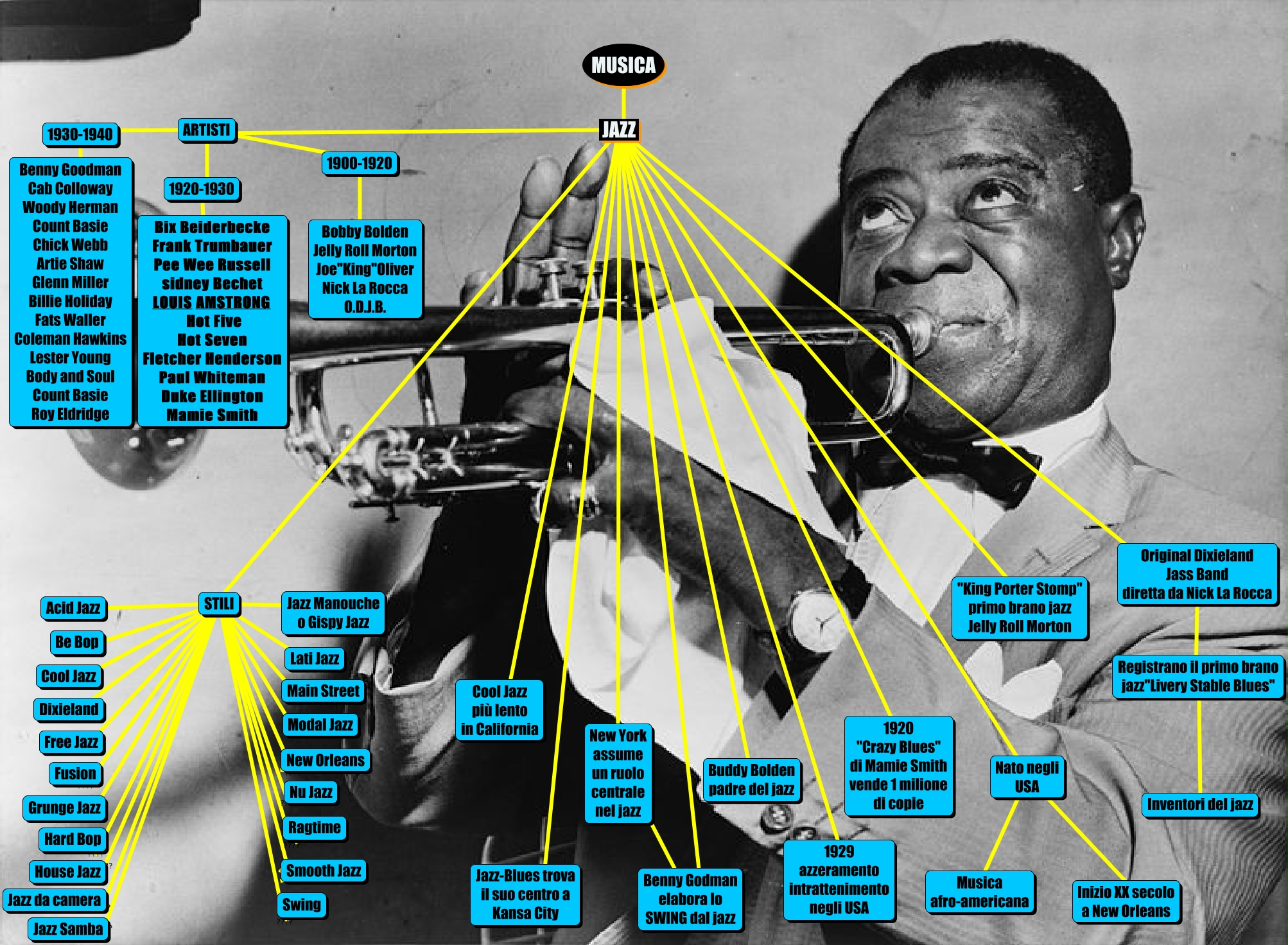 Questa Cmap, creata con IHMC CmapTools, contiene informazioni relative a: mappa esame e musica emil, 1920-1930 ???? Bix Beiderbecke Frank Trumbauer Pee Wee Russell sidney Bechet LOUIS AMSTRONG Hot Five Hot Seven Fletcher Henderson Paul Whiteman Duke Ellington Mamie Smith, JAZZ ???? Nato negli USA, STILI ???? Jazz Manouche o Gispy Jazz, STILI ???? Ragtime, JAZZ ???? STILI, JAZZ ???? Jazz-Blues trova il suo centro a Kansa City, STILI ???? Swing, JAZZ ???? ARTISTI, Benny Godman elabora lo SWING dal jazz ???? New York assume un ruolo centrale nel jazz, STILI ???? New Orleans, STILI ???? Free Jazz, STILI ???? Acid Jazz, STILI ???? Jazz da camera, STILI ???? Cool Jazz, ARTISTI ???? 1930-1940, ARTISTI ???? 1900-1920, JAZZ ???? "King Porter Stomp" primo brano jazz Jelly Roll Morton, STILI ???? Smooth Jazz, STILI ???? Lati Jazz, JAZZ ???? Cool Jazz più lento in California