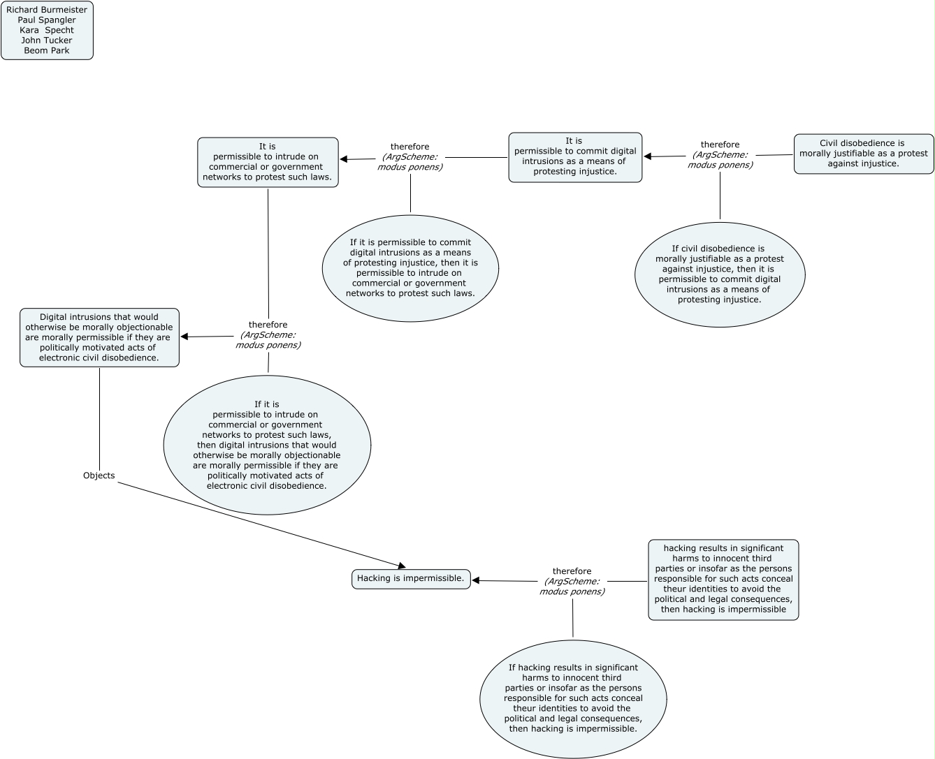 This Concept Map, created with IHMC CmapTools, has information related to: KaraHacking, Civil disobedience is morally justifiable as a protest against injustice. therefore (ArgScheme: modus ponens) It is permissible to commit digital intrusions as a means of protesting injustice., It is permissible to commit digital intrusions as a means of protesting injustice. therefore (ArgScheme: modus ponens) It is permissible to intrude on commercial or government networks to protest such laws., Digital intrusions that would otherwise be morally objectionable are morally permissible if they are politically motivated acts of electronic civil disobedience. Objects Hacking is impermissible., If it is permissible to intrude on commercial or government networks to protest such laws, then digital intrusions that would otherwise be morally objectionable are morally permissible if they are politically motivated acts of electronic civil disobedience. therefore (ArgScheme: modus ponens) Digital intrusions that would otherwise be morally objectionable are morally permissible if they are politically motivated acts of electronic civil disobedience., hacking results in significant harms to innocent third parties or insofar as the persons responsible for such acts conceal theur identities to avoid the political and legal consequences, then hacking is impermissible therefore (ArgScheme: modus ponens) Hacking is impermissible., If civil disobedience is morally justifiable as a protest against injustice, then it is permissible to commit digital intrusions as a means of protesting injustice. therefore (ArgScheme: modus ponens) It is permissible to commit digital intrusions as a means of protesting injustice., If hacking results in significant harms to innocent third parties or insofar as the persons responsible for such acts conceal theur identities to avoid the political and legal consequences, then hacking is impermissible. therefore (ArgScheme: modus ponens) Hacking is impermissible., It is permissible to intrude on commercial or government networks to protest such laws. therefore (ArgScheme: modus ponens) Digital intrusions that would otherwise be morally objectionable are morally permissible if they are politically motivated acts of electronic civil disobedience., If it is permissible to commit digital intrusions as a means of protesting injustice, then it is permissible to intrude on commercial or government networks to protest such laws. therefore (ArgScheme: modus ponens) It is permissible to intrude on commercial or government networks to protest such laws.