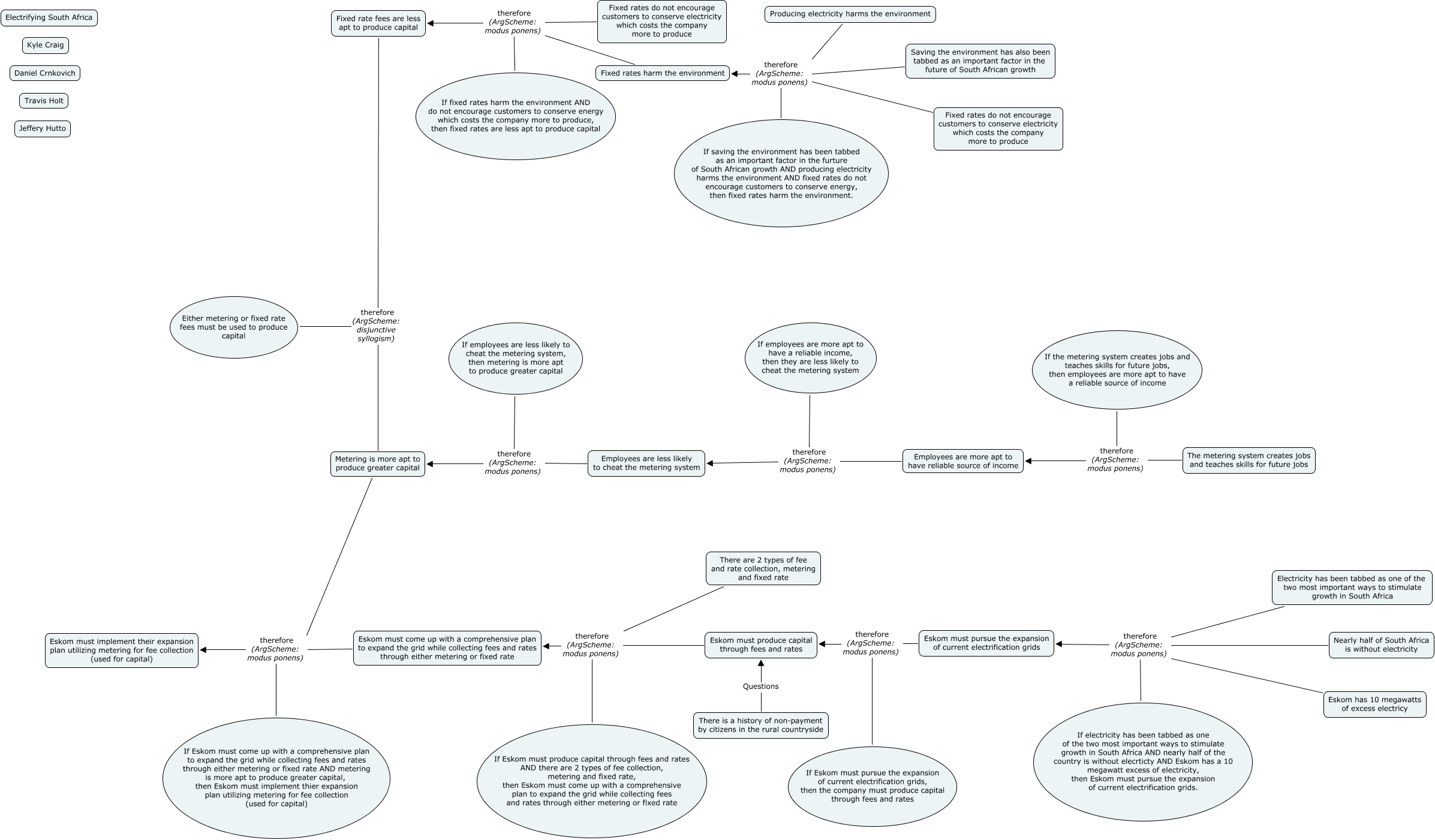 This Concept Map, created with IHMC CmapTools, has information related to: Electrifying South Africa, If electricity has been tabbed as one of the two most important ways to stimulate growth in South Africa AND nearly half of the country is without elecrticty AND Eskom has a 10 megawatt excess of electricity, then Eskom must pursue the expansion of current electrification grids. therefore (ArgScheme: modus ponens) Eskom must pursue the expansion of current electrification grids, If employees are less likely to cheat the metering system, then metering is more apt to produce greater capital therefore (ArgScheme: modus ponens) Metering is more apt to produce greater capital, If employees are more apt to have a reliable income, then they are less likely to cheat the metering system therefore (ArgScheme: modus ponens) Employees are less likely to cheat the metering system, Fixed rates harm the environment therefore (ArgScheme: modus ponens) Fixed rate fees are less apt to produce capital, There is a history of non-payment by citizens in the rural countryside Questions Eskom must produce capital through fees and rates, Eskom must come up with a comprehensive plan to expand the grid while collecting fees and rates through either metering or fixed rate therefore (ArgScheme: modus ponens) Eskom must implement their expansion plan utilizing metering for fee collection (used for capital), There are 2 types of fee and rate collection, metering and fixed rate therefore (ArgScheme: modus ponens) Eskom must come up with a comprehensive plan to expand the grid while collecting fees and rates through either metering or fixed rate, Eskom must pursue the expansion of current electrification grids therefore (ArgScheme: modus ponens) Eskom must produce capital through fees and rates, Electricity has been tabbed as one of the two most important ways to stimulate growth in South Africa therefore (ArgScheme: modus ponens) Eskom must pursue the expansion of current electrification grids, Fixed rates do not encourage customers to conserve electricity which costs the company more to produce therefore (ArgScheme: modus ponens) Fixed rate fees are less apt to produce capital, If fixed rates harm the environment AND do not encourage customers to conserve energy which costs the company more to produce, then fixed rates are less apt to produce capital therefore (ArgScheme: modus ponens) Fixed rate fees are less apt to produce capital, The metering system creates jobs and teaches skills for future jobs therefore (ArgScheme: modus ponens) Employees are more apt to have reliable source of income, If saving the environment has been tabbed as an important factor in the furture of South African growth AND producing electricity harms the environment AND fixed rates do not encourage customers to conserve energy, then fixed rates harm the environment. therefore (ArgScheme: modus ponens) Fixed rates harm the environment, Eskom must produce capital through fees and rates therefore (ArgScheme: modus ponens) Eskom must come up with a comprehensive plan to expand the grid while collecting fees and rates through either metering or fixed rate, If Eskom must pursue the expansion of current electrification grids, then the company must produce capital through fees and rates therefore (ArgScheme: modus ponens) Eskom must produce capital through fees and rates, Employees are more apt to have reliable source of income therefore (ArgScheme: modus ponens) Employees are less likely to cheat the metering system, Metering is more apt to produce greater capital therefore (ArgScheme: modus ponens) Eskom must implement their expansion plan utilizing metering for fee collection (used for capital), Producing electricity harms the environment therefore (ArgScheme: modus ponens) Fixed rates harm the environment, Fixed rate fees are less apt to produce capital therefore (ArgScheme: disjunctive syllogism) Metering is more apt to produce greater capital, Employees are less likely to cheat the metering system therefore (ArgScheme: modus ponens) Metering is more apt to produce greater capital
