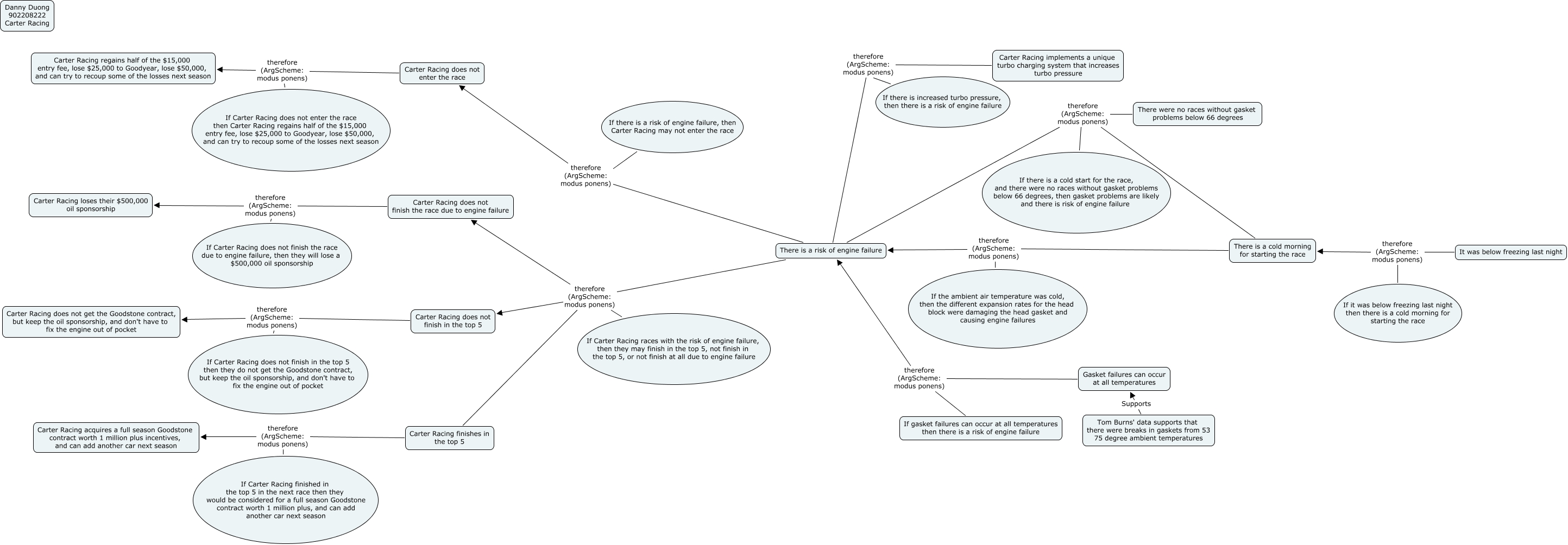 This Concept Map, created with IHMC CmapTools, has information related to: Danny Duong Carter Racing, There is a cold morning for starting the race therefore (ArgScheme: modus ponens) There is a risk of engine failure, There were no races without gasket problems below 66 degrees therefore (ArgScheme: modus ponens) There is a risk of engine failure, If Carter Racing races with the risk of engine failure, then they may finish in the top 5, not finish in the top 5, or not finish at all due to engine failure therefore (ArgScheme: modus ponens) Carter Racing does not finish the race due to engine failure, Carter Racing does not finish in the top 5 therefore (ArgScheme: modus ponens) Carter Racing does not get the Goodstone contract, but keep the oil sponsorship, and don't have to fix the engine out of pocket, If Carter Racing does not finish in the top 5 then they do not get the Goodstone contract, but keep the oil sponsorship, and don't have to fix the engine out of pocket therefore (ArgScheme: modus ponens) Carter Racing does not get the Goodstone contract, but keep the oil sponsorship, and don't have to fix the engine out of pocket, If there is a risk of engine failure, then Carter Racing may not enter the race therefore (ArgScheme: modus ponens) Carter Racing does not enter the race, There is a risk of engine failure therefore (ArgScheme: modus ponens) Carter Racing finishes in the top 5, Carter Racing implements a unique turbo charging system that increases turbo pressure therefore (ArgScheme: modus ponens) There is a risk of engine failure, If Carter Racing finished in the top 5 in the next race then they would be considered for a full season Goodstone contract worth 1 million plus, and can add another car next season therefore (ArgScheme: modus ponens) Carter Racing acquires a full season Goodstone contract worth 1 million plus incentives, and can add another car next season, It was below freezing last night therefore (ArgScheme: modus ponens) There is a cold morning for starting the race, If Carter Racing does not finish the race due to engine failure, then they will lose a $500,000 oil sponsorship therefore (ArgScheme: modus ponens) Carter Racing loses their $500,000 oil sponsorship, Gasket failures can occur at all temperatures therefore (ArgScheme: modus ponens) There is a risk of engine failure, Carter Racing does not enter the race therefore (ArgScheme: modus ponens) Carter Racing regains half of the $15,000 entry fee, lose $25,000 to Goodyear, lose $50,000, and can try to recoup some of the losses next season, If Carter Racing does not enter the race then Carter Racing regains half of the $15,000 entry fee, lose $25,000 to Goodyear, lose $50,000, and can try to recoup some of the losses next season therefore (ArgScheme: modus ponens) Carter Racing regains half of the $15,000 entry fee, lose $25,000 to Goodyear, lose $50,000, and can try to recoup some of the losses next season, If there is increased turbo pressure, then there is a risk of engine failure therefore (ArgScheme: modus ponens) There is a risk of engine failure, There is a risk of engine failure therefore (ArgScheme: modus ponens) Carter Racing does not finish the race due to engine failure, If gasket failures can occur at all temperatures then there is a risk of engine failure therefore (ArgScheme: modus ponens) There is a risk of engine failure, If Carter Racing races with the risk of engine failure, then they may finish in the top 5, not finish in the top 5, or not finish at all due to engine failure therefore (ArgScheme: modus ponens) Carter Racing does not finish in the top 5, There is a risk of engine failure therefore (ArgScheme: modus ponens) Carter Racing does not finish in the top 5, Tom Burns' data supports that there were breaks in gaskets from 53 75 degree ambient temperatures Supports Gasket failures can occur at all temperatures