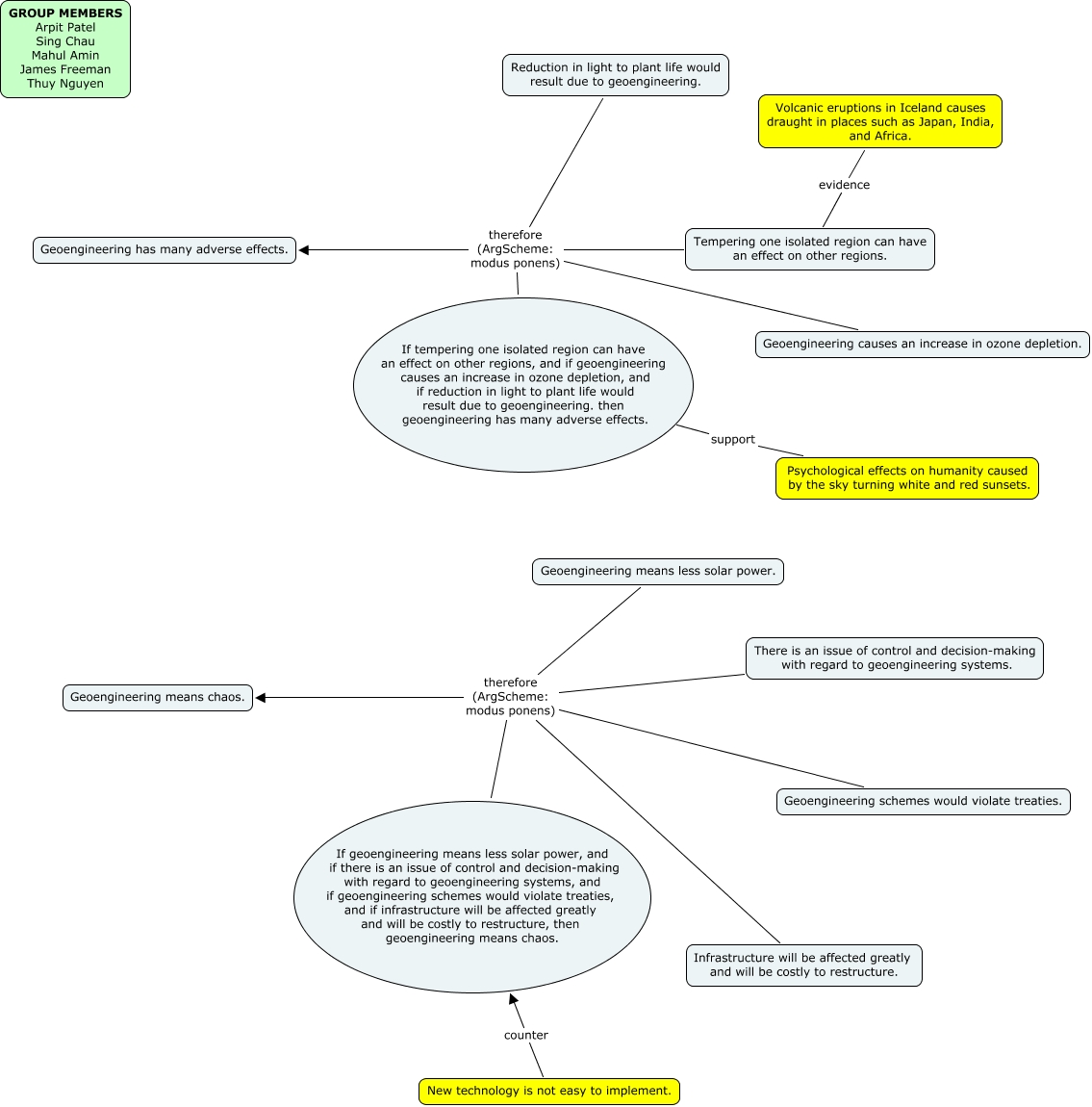 This Concept Map, created with IHMC CmapTools, has information related to: groupgeoengineering, Geoengineering means less solar power. therefore (ArgScheme: modus ponens) Geoengineering means chaos., If tempering one isolated region can have an effect on other regions, and if geoengineering causes an increase in ozone depletion, and if reduction in light to plant life would result due to geoengineering. then geoengineering has many adverse effects. therefore (ArgScheme: modus ponens) Geoengineering has many adverse effects., New technology is not easy to implement. counter If geoengineering means less solar power, and if there is an issue of control and decision-making with regard to geoengineering systems, and if geoengineering schemes would violate treaties, and if infrastructure will be affected greatly and will be costly to restructure, then geoengineering means chaos., Reduction in light to plant life would result due to geoengineering. therefore (ArgScheme: modus ponens) Geoengineering has many adverse effects., Tempering one isolated region can have an effect on other regions. therefore (ArgScheme: modus ponens) Geoengineering has many adverse effects., Geoengineering schemes would violate treaties. therefore (ArgScheme: modus ponens) Geoengineering means chaos., Geoengineering causes an increase in ozone depletion. therefore (ArgScheme: modus ponens) Geoengineering has many adverse effects., If geoengineering means less solar power, and if there is an issue of control and decision-making with regard to geoengineering systems, and if geoengineering schemes would violate treaties, and if infrastructure will be affected greatly and will be costly to restructure, then geoengineering means chaos. therefore (ArgScheme: modus ponens) Geoengineering means chaos., Infrastructure will be affected greatly and will be costly to restructure. therefore (ArgScheme: modus ponens) Geoengineering means chaos., Psychological effects on humanity caused by the sky turning white and red sunsets. support If tempering one isolated region can have an effect on other regions, and if geoengineering causes an increase in ozone depletion, and if reduction in light to plant life would result due to geoengineering. then geoengineering has many adverse effects., There is an issue of control and decision-making with regard to geoengineering systems. therefore (ArgScheme: modus ponens) Geoengineering means chaos., Volcanic eruptions in Iceland causes draught in places such as Japan, India, and Africa. evidence Tempering one isolated region can have an effect on other regions.