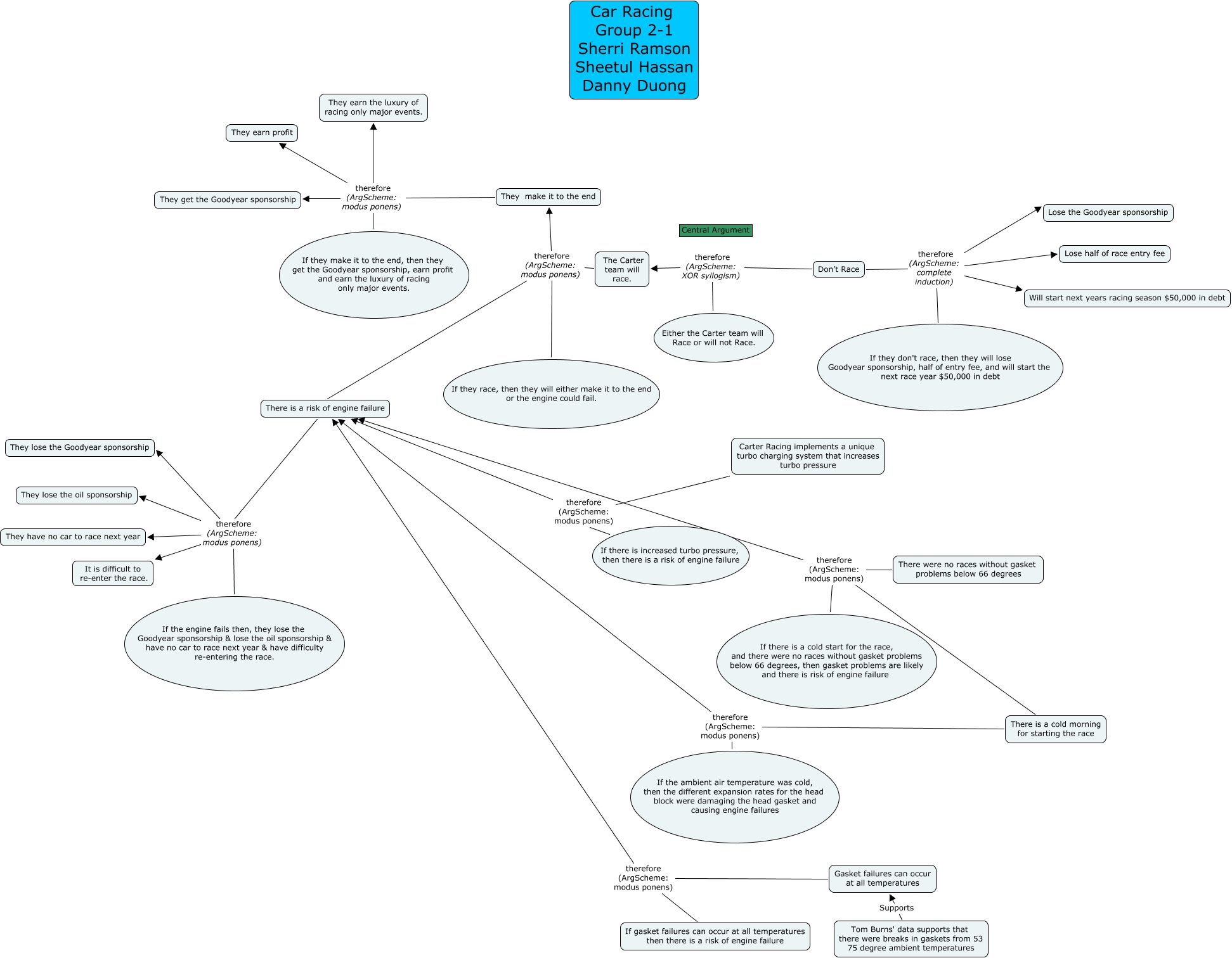 This Concept Map, created with IHMC CmapTools, has information related to: Group Map Updated 7-6, They make it to the end therefore (ArgScheme: modus ponens) They get the Goodyear sponsorship, There is a risk of engine failure therefore (ArgScheme: modus ponens) They lose the oil sponsorship, Don't Race therefore (ArgScheme: complete induction) Will start next years racing season $50,000 in debt, If they make it to the end, then they get the Goodyear sponsorship, earn profit and earn the luxury of racing only major events. therefore (ArgScheme: modus ponens) They earn profit, If they make it to the end, then they get the Goodyear sponsorship, earn profit and earn the luxury of racing only major events. therefore (ArgScheme: modus ponens) They get the Goodyear sponsorship, If they race, then they will either make it to the end or the engine could fail. therefore (ArgScheme: modus ponens) They make it to the end, If the engine fails then, they lose the Goodyear sponsorship & lose the oil sponsorship & have no car to race next year & have difficulty re-entering the race. therefore (ArgScheme: modus ponens) They have no car to race next year, There were no races without gasket problems below 66 degrees therefore (ArgScheme: modus ponens) There is a risk of engine failure, Carter Racing implements a unique turbo charging system that increases turbo pressure therefore (ArgScheme: modus ponens) There is a risk of engine failure, Either the Carter team will Race or will not Race. therefore (ArgScheme: XOR syllogism) Don't Race, There is a risk of engine failure therefore (ArgScheme: modus ponens) They have no car to race next year, If there is increased turbo pressure, then there is a risk of engine failure therefore (ArgScheme: modus ponens) There is a risk of engine failure, If the ambient air temperature was cold, then the different expansion rates for the head block were damaging the head gasket and causing engine failures therefore (ArgScheme: modus ponens) There is a risk of engine failure, If gasket failures can occur at all temperatures then there is a risk of engine failure therefore (ArgScheme: modus ponens) There is a risk of engine failure, Don't Race therefore (ArgScheme: complete induction) If they don't race, then they will lose Goodyear sponsorship, half of entry fee, and will start the next race year $50,000 in debt, Either the Carter team will Race or will not Race. therefore (ArgScheme: XOR syllogism) The Carter team will race., If the engine fails then, they lose the Goodyear sponsorship & lose the oil sponsorship & have no car to race next year & have difficulty re-entering the race. therefore (ArgScheme: modus ponens) They lose the Goodyear sponsorship, Don't Race therefore (ArgScheme: complete induction) Lose half of race entry fee, The Carter team will race. therefore (ArgScheme: modus ponens) They make it to the end, If the engine fails then, they lose the Goodyear sponsorship & lose the oil sponsorship & have no car to race next year & have difficulty re-entering the race. therefore (ArgScheme: modus ponens) They lose the oil sponsorship