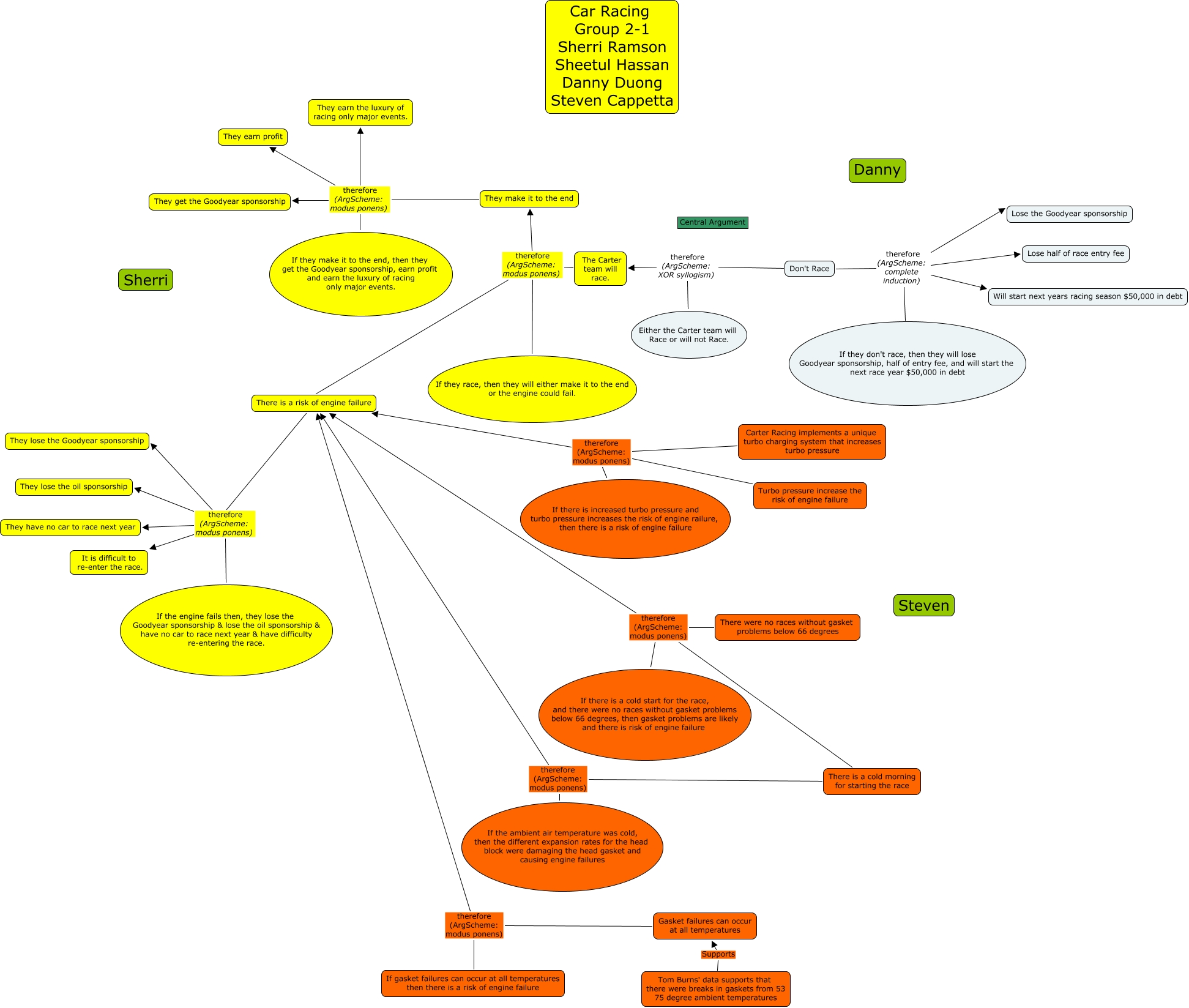 This Concept Map, created with IHMC CmapTools, has information related to: Group Map Updated Don't change this one, There is a cold morning for starting the race therefore (ArgScheme: modus ponens) There is a risk of engine failure, They make it to the end therefore (ArgScheme: modus ponens) They earn profit, Turbo pressure increase the risk of engine failure therefore (ArgScheme: modus ponens) There is a risk of engine failure, The Carter team will race. therefore (ArgScheme: modus ponens) They make it to the end, If the engine fails then, they lose the Goodyear sponsorship & lose the oil sponsorship & have no car to race next year & have difficulty re-entering the race. therefore (ArgScheme: modus ponens) They lose the Goodyear sponsorship, Don't Race therefore (ArgScheme: complete induction) Lose half of race entry fee, The Carter team will race. therefore (ArgScheme: modus ponens) There is a risk of engine failure, If the engine fails then, they lose the Goodyear sponsorship & lose the oil sponsorship & have no car to race next year & have difficulty re-entering the race. therefore (ArgScheme: modus ponens) They have no car to race next year, If they make it to the end, then they get the Goodyear sponsorship, earn profit and earn the luxury of racing only major events. therefore (ArgScheme: modus ponens) They get the Goodyear sponsorship, Carter Racing implements a unique turbo charging system that increases turbo pressure therefore (ArgScheme: modus ponens) There is a risk of engine failure, They make it to the end therefore (ArgScheme: modus ponens) They get the Goodyear sponsorship, If they race, then they will either make it to the end or the engine could fail. therefore (ArgScheme: modus ponens) They make it to the end, Tom Burns' data supports that there were breaks in gaskets from 53 75 degree ambient temperatures Supports Gasket failures can occur at all temperatures, There is a risk of engine failure therefore (ArgScheme: modus ponens) They lose the oil sponsorship, There is a risk of engine failure therefore (ArgScheme: modus ponens) They have no car to race next year, If gasket failures can occur at all temperatures then there is a risk of engine failure therefore (ArgScheme: modus ponens) There is a risk of engine failure, Either the Carter team will Race or will not Race. therefore (ArgScheme: XOR syllogism) The Carter team will race., They make it to the end therefore (ArgScheme: modus ponens) They earn the luxury of racing only major events., If there is a cold start for the race, and there were no races without gasket problems below 66 degrees, then gasket problems are likely and there is risk of engine failure therefore (ArgScheme: modus ponens) There is a risk of engine failure, There is a cold morning for starting the race therefore (ArgScheme: modus ponens) There is a risk of engine failure