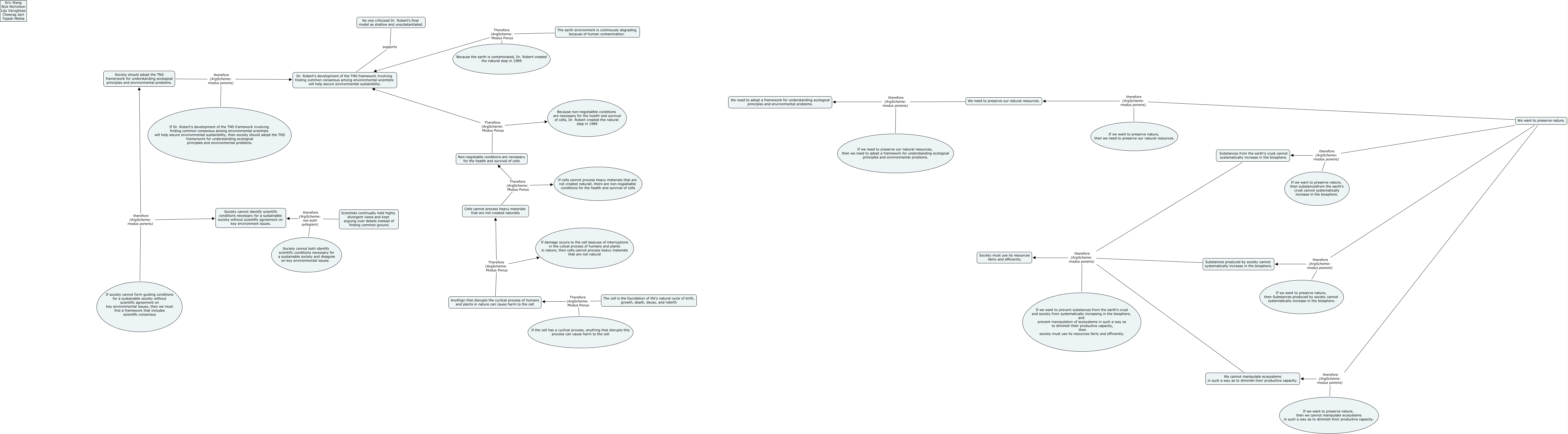 This Concept Map, created with IHMC CmapTools, has information related to: tosubmit, Anythign that disrupts the cyclical process of humans and plants in nature can cause harm to the cell Therefore (ArgScheme: Modus Ponus If damage occurs to the cell beacuse of interruptions in the cylical process of humans and plants in nature, then cells cannot process heavy materials that are not natural, If Dr. Robert's development of the TNS framework involving finding common consensus among environmental scientists will help secure environmental sustainbility, then society should adopt the TNS framerwork for understanding ecological principles and environmental problems. therefore (ArgScheme: modus ponens) Dr. Robert's development of the TNS framework involving finding common consensus among environmental scientists will help secure environmental sustainbility., The earth environment is continously degrading because of human contamination. Therefore (ArgScheme: Modus Ponus Dr. Robert's development of the TNS framework involving finding common consensus among environmental scientists will help secure environmental sustainbility., Non-negotiable conditions are necessary for the health and survival of cells Therefore (ArgScheme: Modus Ponus Dr. Robert's development of the TNS framework involving finding common consensus among environmental scientists will help secure environmental sustainbility., No one criticized Dr. Robert's final model as shallow and unsubstantiated. supports Dr. Robert's development of the TNS framework involving finding common consensus among environmental scientists will help secure environmental sustainbility., If society cannot form guiding conditions for a sustainable society without scientific agreement on key environmental issues, then we must find a framework that includes scientific consensus therefore (ArgScheme: modus ponens) Society cannot identify scientific conditions necessary for a sustainable society without scientific agreement on key environment issues., We want to preserve nature. therefore (ArgScheme: modus ponens) Substances from the earth's crust cannot systematically increase in the biosphere., Non-negotiable conditions are necessary for the health and survival of cells Therefore (ArgScheme: Modus Ponus Because non-negotiatble conditions are necessary for the health and survival of cells, Dr. Robert created the natural step in 1989, If we want to preserve nature, then we cannot manipulate ecosystems in such a way as to diminish their productive capacity. therefore (ArgScheme: modus ponens) We cannot manipulate ecosystems in such a way as to diminish their productive capacity., We want to preserve nature. therefore (ArgScheme: modus ponens) We cannot manipulate ecosystems in such a way as to diminish their productive capacity., Society cannot both identify scientific conditions necessary for a sustainable society and disagree on key environmental issues. therefore (ArgScheme: not-both syllogism) Scientists continually held highly divergent views and kept arguing over details instead of finding common ground., We want to preserve nature. therefore (ArgScheme: modus ponens) Substances produced by society cannot systematically increase in the biosphere., The cell is the foundation of life's natural cycle of birth, growth, death, decay, and rebirth Therefore (ArgScheme: Modus Ponus Anythign that disrupts the cyclical process of humans and plants in nature can cause harm to the cell, Society should adopt the TNS framerwork for understanding ecological principles and environmental problems. therefore (ArgScheme: modus ponens) Dr. Robert's development of the TNS framework involving finding common consensus among environmental scientists will help secure environmental sustainbility., We need to preserve our natural resources. therefore (ArgScheme: modus ponens) We need to adopt a framework for understanding ecological principles and environmental problems., We cannot manipulate ecosystems in such a way as to diminish their productive capacity. therefore (ArgScheme: modus ponens) Society must use its resources fairly and efficiently., If the cell has a cyclical process, anything that disrupts this process can cause harm to the cell Therefore (ArgScheme: Modus Ponus Anythign that disrupts the cyclical process of humans and plants in nature can cause harm to the cell, If we want to preserve nature, then substancesfrom the earth's crust cannot systematically increase in the biosphere. therefore (ArgScheme: modus ponens) Substances from the earth's crust cannot systematically increase in the biosphere., We want to preserve nature. therefore (ArgScheme: modus ponens) We need to preserve our natural resources., The earth environment is continously degrading because of human contamination. Therefore (ArgScheme: Modus Ponus Because the earth is contaminated, Dr. Robert created the natural step in 1989
