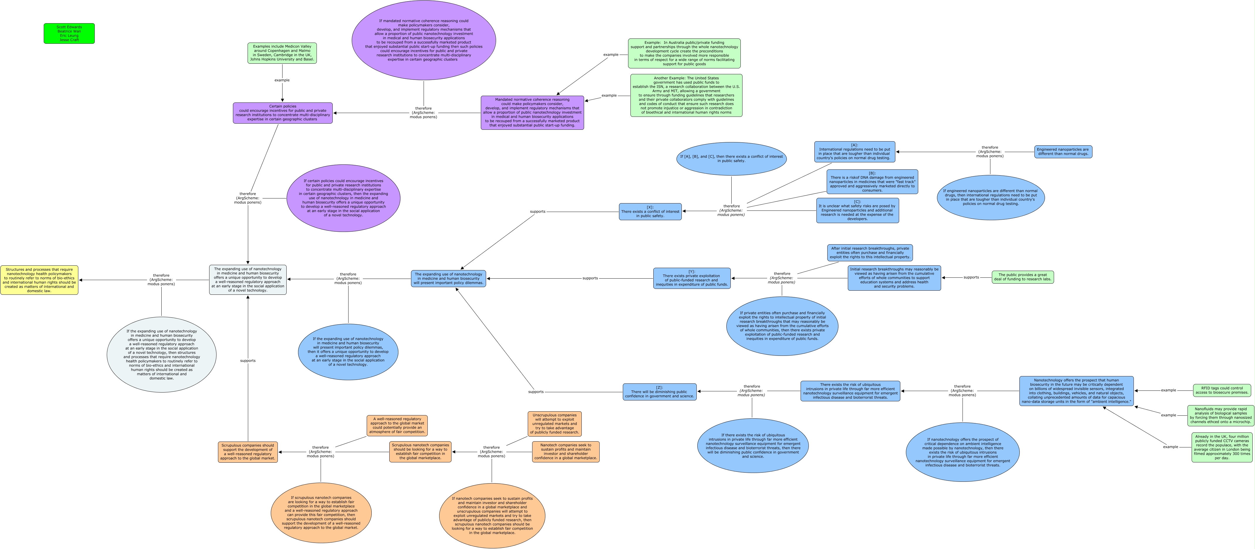 This Concept Map, created with IHMC CmapTools, has information related to: Final Map, Scrupulous companies should support the development of a well-reasoned regulatory approach to the global market. supports The expanding use of nanotechnology in medicine and human biosecurity offers a unique opportunity to develop a well-reasoned regulatory approach at an early stage in the social application of a novel technology., If nanotech companies seek to sustain profits and maintain investor and shareholder confidence in a global marketplace and unscrupulous companies will attempt to exploit unregulated markets and try to take advantage of publicly funded research, then scrupulous nanotech companies should be looking for a way to establish fair competition in the global marketplace. therefore (ArgScheme: modus ponens) Scrupulous nanotech companies should be looking for a way to establish fair competition in the global marketplace., [A]: International regulations need to be put in place that are tougher than individual country's policies on normal drug testing. therefore (ArgScheme: modus ponens) [X]: There exists a conflict of interest in public safety., The expanding use of nanotechnology in medicine and human biosecurity offers a unique opportunity to develop a well-reasoned regulatory approach at an early stage in the social application of a novel technology. therefore (ArgScheme: modus ponens) Structures and processes that require nanotechnology health policymakers to routinely refer to norms of bio-ethics and international human rights should be created as matters of international and domestic law., Mandated normative coherence reasoning could make policymakers consider, develop, and implement regulatory mechanisms that allow a proportion of public nanotechnology investment in medical and human biosecurity applications to be recouped from a successfully marketed product that enjoyed substantial public start-up funding. therefore (ArgScheme: modus ponens) Certain policies could encourage incentives for public and private research institutions to concentrate multi-disciplinary expertise in certain geographic clusters, [X]: There exists a conflict of interest in public safety. supports The expanding use of nanotechnology in medicine and human biosecurity will present important policy dilemmas., Certain policies could encourage incentives for public and private research institutions to concentrate multi-disciplinary expertise in certain geographic clusters therefore (ArgScheme: modus ponens) If certain policies could encourage incentives for public and private research institutions to concentrate multi-disciplinary expertise in certain geographic clusters, then the expanding use of nanotechnology in medicine and human biosecurity offers a unique opportunity to develop a well-reasoned regulatory approach at an early stage in the social application of a novel technology., Examples include Medicon Valley around Copenhagen and Malmo in Sweden, Cambridge in the UK, Johns Hopkins University and Basel. example Certain policies could encourage incentives for public and private research institutions to concentrate multi-disciplinary expertise in certain geographic clusters, Another Example: The United States government has used public funds to establish the ISN, a research collaboration between the U.S. Army and MIT, allowing a government to ensure through funding guidelines that researchers and their private collaborators comply with guidelines and codes of conduct that ensure such research does not promote injustice or aggression in contradiction of bioethical and international human rights norms example Mandated normative coherence reasoning could make policymakers consider, develop, and implement regulatory mechanisms that allow a proportion of public nanotechnology investment in medical and human biosecurity applications to be recouped from a successfully marketed product that enjoyed substantial public start-up funding., [B]: There is a riskof DNA damage from engineered nanoparticles in medicines that were "fast track" approved and aggressively marketed directly to consumers. therefore (ArgScheme: modus ponens) [X]: There exists a conflict of interest in public safety., The expanding use of nanotechnology in medicine and human biosecurity will present important policy dilemmas. therefore (ArgScheme: modus ponens) The expanding use of nanotechnology in medicine and human biosecurity offers a unique opportunity to develop a well-reasoned regulatory approach at an early stage in the social application of a novel technology., If engineered nanoparticles are different than normal drugs, then international regulations need to be put in place that are tougher than individual country's policies on normal drug testing. therefore (ArgScheme: modus ponens) [A]: International regulations need to be put in place that are tougher than individual country's policies on normal drug testing., Engineered nanoparticles are different than normal drugs. therefore (ArgScheme: modus ponens) [A]: International regulations need to be put in place that are tougher than individual country's policies on normal drug testing., If [A], [B], and [C], then there exists a conflict of interest in public safety. therefore (ArgScheme: modus ponens) [X]: There exists a conflict of interest in public safety., If private entities often purchase and financially exploit the rights to intellectual property of initial research breakthroughs that may reasonably be viewed as having arisen from the cumulative efforts of whole communities, then there exists private exploitation of public-funded research and inequities in expenditure of public funds. therefore (ArgScheme: modus ponens) [Y]: There exists private exploitation of public-funded research and inequities in expenditure of public funds., [Y]: There exists private exploitation of public-funded research and inequities in expenditure of public funds. supports The expanding use of nanotechno