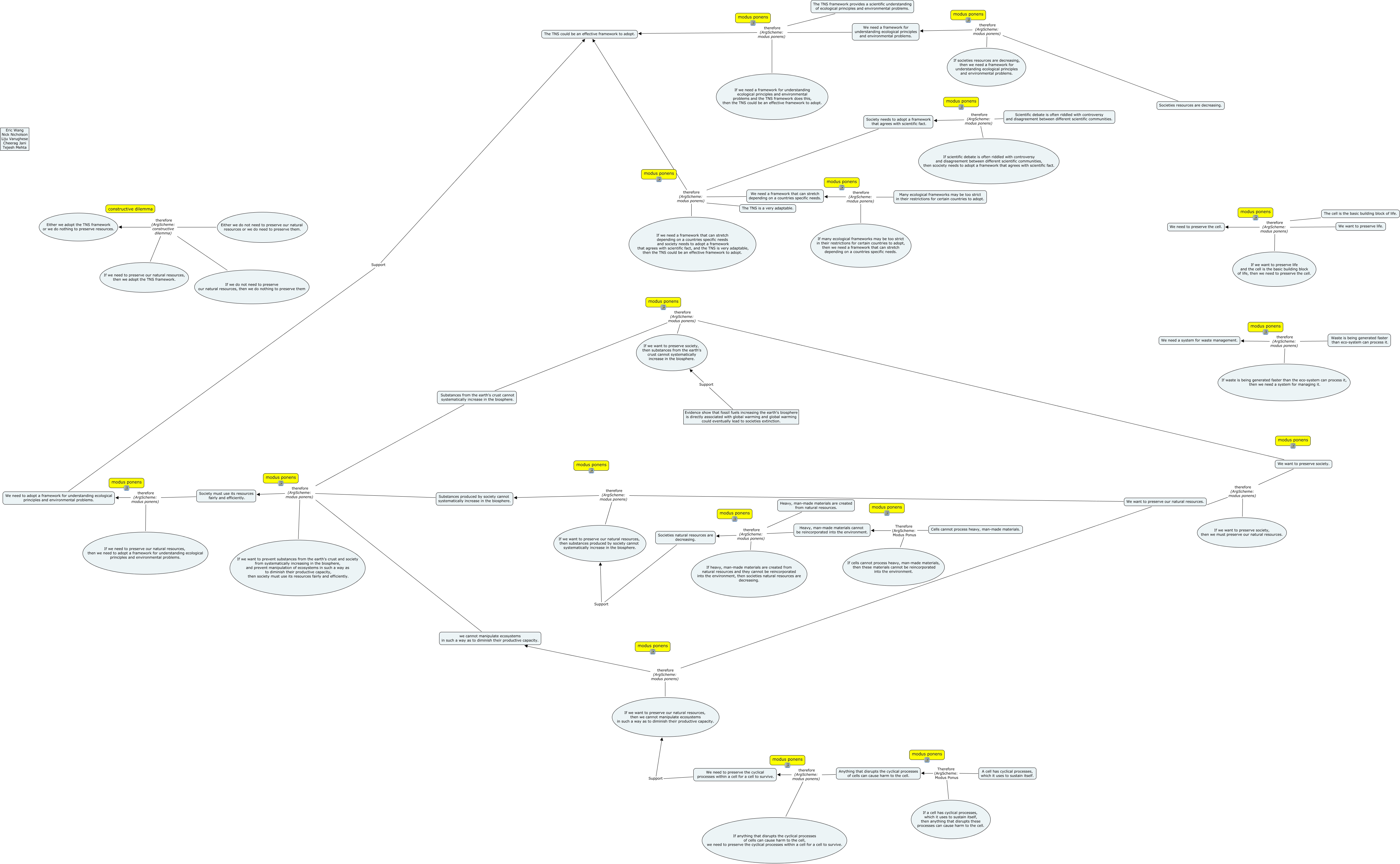 This Concept Map, created with IHMC CmapTools, has information related to: TNS Final, If a cell has cyclical processes, which it uses to sustain itself, then anything that disrupts these processes can cause harm to the cell. Therefore (ArgScheme: Modus Ponus Anything that disrupts the cyclical processes of cells can cause harm to the cell., We want to preserve our natural resources. therefore (ArgScheme: modus ponens) Substances produced by society cannot systematically increase in the biosphere., Anything that disrupts the cyclical processes of cells can cause harm to the cell. therefore (ArgScheme: modus ponens) We need to preserve the cyclical processes within a cell for a cell to survive., The TNS framework provides a scientific understanding of ecological principles and environmental problems. therefore (ArgScheme: modus ponens) The TNS could be an effective framework to adopt., We want to preserve our natural resources. therefore (ArgScheme: modus ponens) we cannot manipulate ecosystems in such a way as to diminish their productive capacity., If we need to preserve our natural resources, then we need to adopt a framework for understanding ecological principles and environmental problems. therefore (ArgScheme: modus ponens) We need to adopt a framework for understanding ecological principles and environmental problems., we cannot manipulate ecosystems in such a way as to diminish their productive capacity. therefore (ArgScheme: modus ponens) Society must use its resources fairly and efficiently., A cell has cyclical processes, which it uses to sustain itself. Therefore (ArgScheme: Modus Ponus Anything that disrupts the cyclical processes of cells can cause harm to the cell., Heavy, man-made materials cannot be reincorporated into the environment. therefore (ArgScheme: modus ponens) Societies natural resources are decreasing., If we need to preserve our natural resources, then we adopt the TNS framework. therefore (ArgScheme: constructive dilemma) Either we adopt the TNS framework or we do nothing to preserve resources., If we want to prevent substances from the earth's crust and society from systematically increasing in the biosphere, and prevent manipulation of ecosystems in such a way as to diminish their productive capacity, then society must use its resources fairly and efficiently. therefore (ArgScheme: modus ponens) Society must use its resources fairly and efficiently., Many ecological frameworks may be too strict in their restrictions for certain countries to adopt. therefore (ArgScheme: modus ponens) We need a framework that can stretch depending on a countries specific needs., If anything that disrupts the cyclical processes of cells can cause harm to the cell, we need to preserve the cyclical processes within a cell for a cell to survive. therefore (ArgScheme: modus ponens) We need to preserve the cyclical processes within a cell for a cell to survive., Evidence show that fossil fuels increasing the earth's biosphere is directly associated with global warming and global warming could eventually lead to societies extinction. Support If we want to preserve society, then substances from the earth's crust cannot systematically increase in the biosphere., If we need a framework that can stretch depending on a countries specific needs and society needs to adopt a framework that agrees with scientific fact, and the TNS is very adaptable, then the TNS could be an effective framework to adopt. therefore (ArgScheme: modus ponens) The TNS could be an effective framework to adopt., If waste is being generated faster than the eco-system can process it, then we need a system for managing it. therefore (ArgScheme: modus ponens) We need a system for waste management., Substances from the earth's crust cannot systematically increase in the biosphere. therefore (ArgScheme: modus ponens) Society must use its resources fairly and efficiently., Substances produced by society cannot systematically increase in the biosphere. therefore (ArgScheme: modus ponens) Society must use its resources fairly and efficiently., We need to adopt a framework for understanding ecological principles and environmental problems. Support The TNS could be an effective framework to adopt., The cell is the basic building block of life. therefore (ArgScheme: modus ponens) We need to preserve the cell.