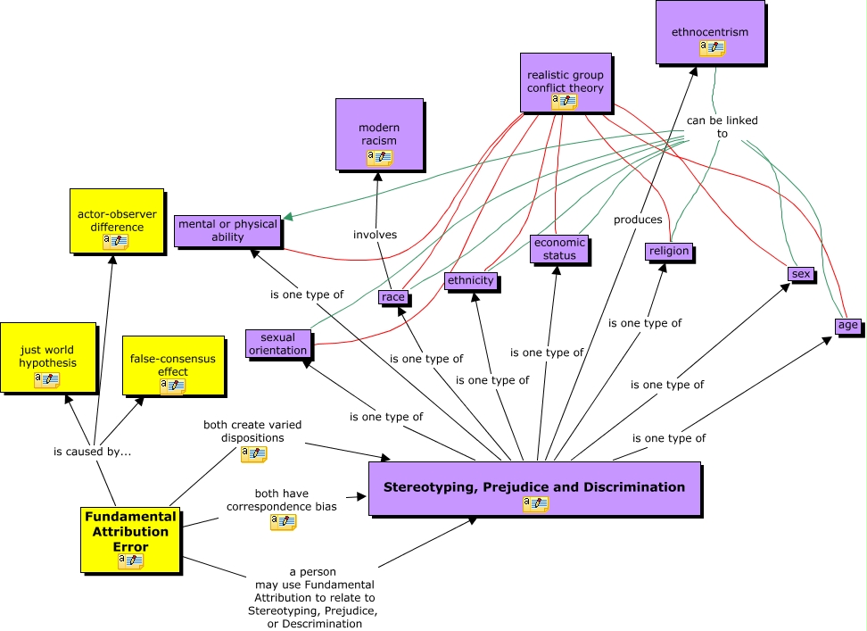 This Concept Map, created with IHMC CmapTools, has information related to: FINAL, sexual orientation realistic group conflict theory sex, ethnocentrism can be linked to ethnicity, Fundamental Attribution Error is caused by... actor-observer difference, Stereotyping, Prejudice and Discrimination produces ethnocentrism, ethnicity realistic group conflict theory sex, sexual orientation realistic group conflict theory economic status, Stereotyping, Prejudice and Discrimination is one type of age, Stereotyping, Prejudice and Discrimination is one type of mental or physical ability, ethnicity realistic group conflict theory economic status, Stereotyping, Prejudice and Discrimination is one type of race, race involves modern racism, Fundamental Attribution Error is caused by... just world hypothesis, ethnocentrism can be linked to sex, Fundamental Attribution Error both create varied dispositions Stereotyping, Prejudice and Discrimination, religion realistic group conflict theory sex, ethnocentrism can be linked to sexual orientation, ethnocentrism can be linked to religion, age realistic group conflict theory economic status, Stereotyping, Prejudice and Discrimination is one type of sexual orientation, Stereotyping, Prejudice and Discrimination is one type of ethnicity