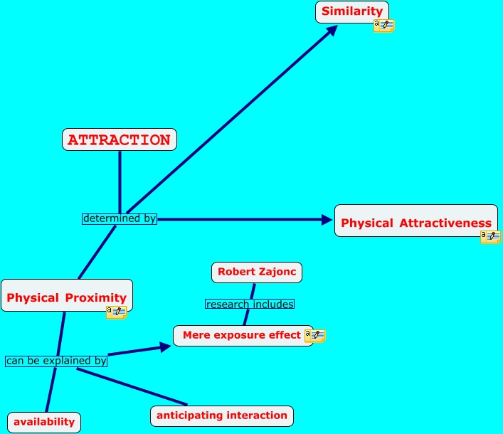 This Concept Map, created with IHMC CmapTools, has information related to: Attraction, Robert Zajonc research includes Mere exposure effect, Physical Proximity can be explained by availability, ATTRACTION determined by Physical Attractiveness, Physical Proximity can be explained by anticipating interaction, Physical Proximity can be explained by Mere exposure effect, ATTRACTION determined by Similarity, ATTRACTION determined by Physical Proximity
