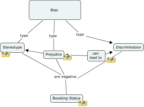 This Concept Map, created with IHMC CmapTools, has information related to: SPD, Prejudice are negative Boosting Status, Stereotype are negative Boosting Status, Discrimination are negative Boosting Status, Bias type Discrimination, Bias type Stereotype, Bias type Prejudice