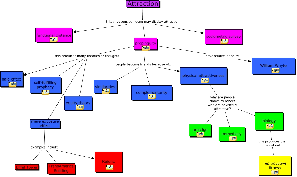 This Concept Map, created with IHMC CmapTools, has information related to: Attraction, propinquity people become friends because of... complementarity, physical attractiveness why are people drawn to others who are physically attractive? prestige, Attraction 3 key reasons someone may display attraction propinquity, Attraction 3 key reasons someone may display attraction sociometric survey, physical attractiveness why are people drawn to others who are physically attractive? immediacy, propinquity people become friends because of... physical attractiveness, physical attractiveness why are people drawn to others who are physically attractive? biology, mere exposure effect examples include Eiffel Tower, propinquity this produces many theories or thoughts halo effect, propinquity people become friends because of... similarities, Attraction 3 key reasons someone may display attraction functional distance, propinquity have studies done by William Whyte, mere exposure effect examples include TransAmerica Building, biology this produces the idea about reproductive fitness, propinquity this produces many theories or thoughts self-fulfilling prophecy, mere exposure effect examples include Kajonc, propinquity this produces many theories or thoughts mere exposure effect, propinquity this produces many theories or thoughts equity theory