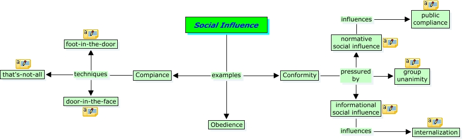 This Concept Map, created with IHMC CmapTools, has information related to: Social Influence, Compiance techniques that's-not-all, Social Influence examples Compiance, Conformity pressured by normative social influence, Social Influence examples Conformity, informational social influence influences internalization, Conformity pressured by informational social influence, normative social influence influences public compliance, Conformity pressured by group unanimity, Compiance techniques foot-in-the-door, Compiance techniques door-in-the-face, Social Influence examples Obedience