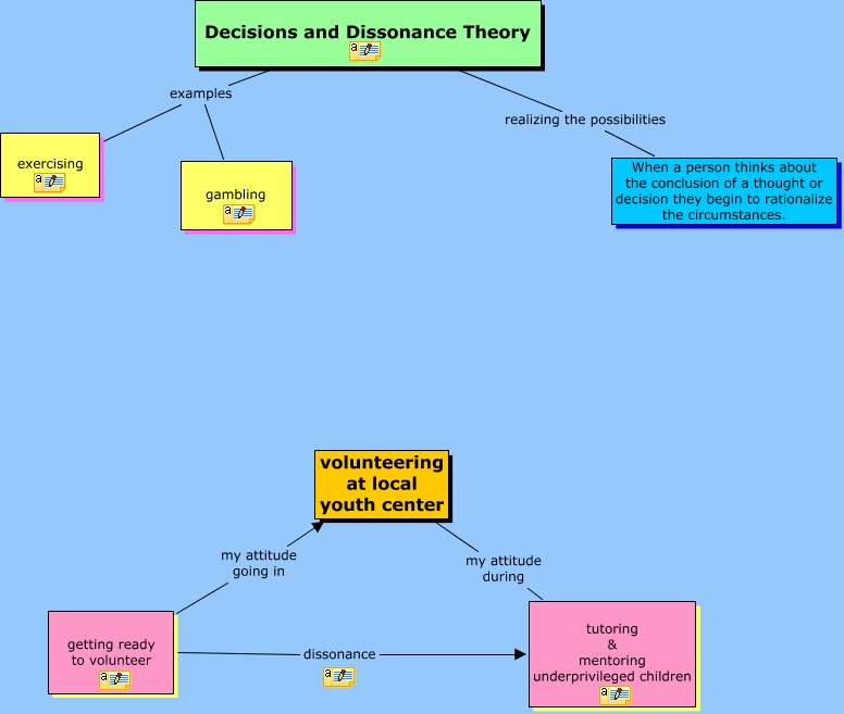 This Concept Map, created with IHMC CmapTools, has information related to: Decisions and Dissonance, Decisions and Dissonance Theory realizing the possibilities When a person thinks about the conclusion of a thought or decision they begin to rationalize the circumstances., getting ready to volunteer my attitude going in volunteering at local youth center, Decisions and Dissonance Theory examples gambling, getting ready to volunteer dissonance tutoring & mentoring underprivileged children, volunteering at local youth center my attitude during tutoring & mentoring underprivileged children, Decisions and Dissonance Theory examples exercising