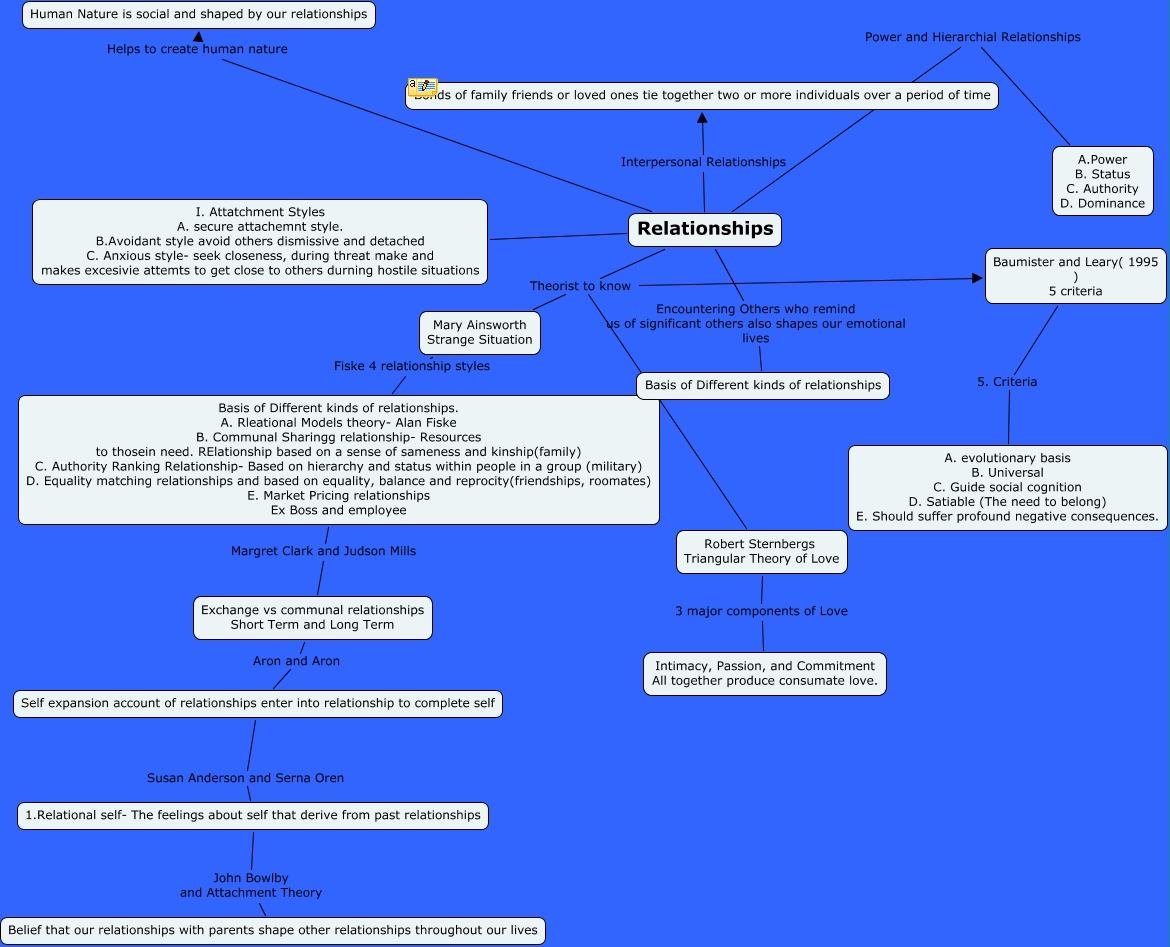 This Concept Map, created with IHMC CmapTools, has information related to: Relationships Chapter 4, Relationships Interpersonal Relationships Bonds of family friends or loved ones tie together two or more individuals over a period of time, Self expansion account of relationships enter into relationship to complete self Susan Anderson and Serna Oren 1.Relational self- The feelings about self that derive from past relationships, Relationships ???? I. Attatchment Styles A. secure attachemnt style. B.Avoidant style avoid others dismissive and detached C. Anxious style- seek closeness, during threat make and makes excesivie attemts to get close to others durning hostile situations, Basis of Different kinds of relationships. A. Rleational Models theory- Alan Fiske B. Communal Sharingg relationship- Resources to thosein need. RElationship based on a sense of sameness and kinship(family) C. Authority Ranking Relationship- Based on hierarchy and status within people in a group (military) D. Equality matching relationships and based on equality, balance and reprocity(friendships, roomates) E. Market Pricing relationships Ex Boss and employee Margret Clark and Judson Mills Exchange vs communal relationships Short Term and Long Term, 1.Relational self- The feelings about self that derive from past relationships John Bowlby and Attachment Theory Belief that our relationships with parents shape other relationships throughout our lives, Relationships Helps to create human nature Human Nature is social and shaped by our relationships, Mary Ainsworth Strange Situation Fiske 4 relationship styles Basis of Different kinds of relationships. A. Rleational Models theory- Alan Fiske B. Communal Sharingg relationship- Resources to thosein need. RElationship based on a sense of sameness and kinship(family) C. Authority Ranking Relationship- Based on hierarchy and status within people in a group (military) D. Equality matching relationships and based on equality, balance and reprocity(friendships, roomates) E. Market Pricing relationships Ex Boss and employee, Relationships Theorist to know Mary Ainsworth Strange Situation, Relationships Theorist to know Robert Sternbergs Triangular Theory of Love, Exchange vs communal relationships Short Term and Long Term Aron and Aron Self expansion account of relationships enter into relationship to complete self, Relationships Power and Hierarchial Relationships A.Power B. Status C. Authority D. Dominance, Robert Sternbergs Triangular Theory of Love 3 major components of Love Intimacy, Passion, and Commitment All together produce consumate love., Baumister and Leary( 1995 ) 5 criteria 5. Criteria A. evolutionary basis B. Universal C. Guide social cognition D. Satiable (The need to belong) E. Should suffer profound negative consequences., Relationships Encountering Others who remind us of significant others also shapes our emotional lives Basis of Different kinds of relationships, Relationships Theorist to know Baumister and Leary( 1995 ) 5 criteria