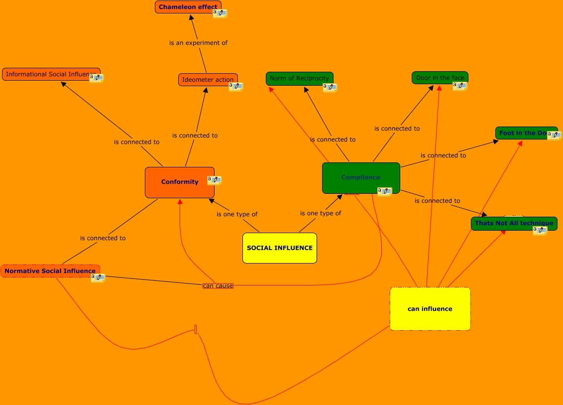 This Concept Map, created with IHMC CmapTools, has information related to: Social Influence, Compliance is connected to Foot in the Door, Conformity is connected to Normative Social Influence, Conformity is connected to Informational Social Influence, Normative Social Influence can cause Conformity, can influence ???? ????, SOCIAL INFLUENCE is one type of Compliance, can influence ???? Door in the face, Compliance is connected to Norm of Reciprocity, Normative Social Influence can cause ????, Compliance is connected to Door in the face, Compliance is connected to Thats Not All technique, can influence ???? Foot in the Door, can influence ???? Norm of Reciprocity, Ideometer action is an experiment of Chameleon effect, SOCIAL INFLUENCE is one type of Conformity, Conformity is connected to Ideometer action, Normative Social Influence can influence
