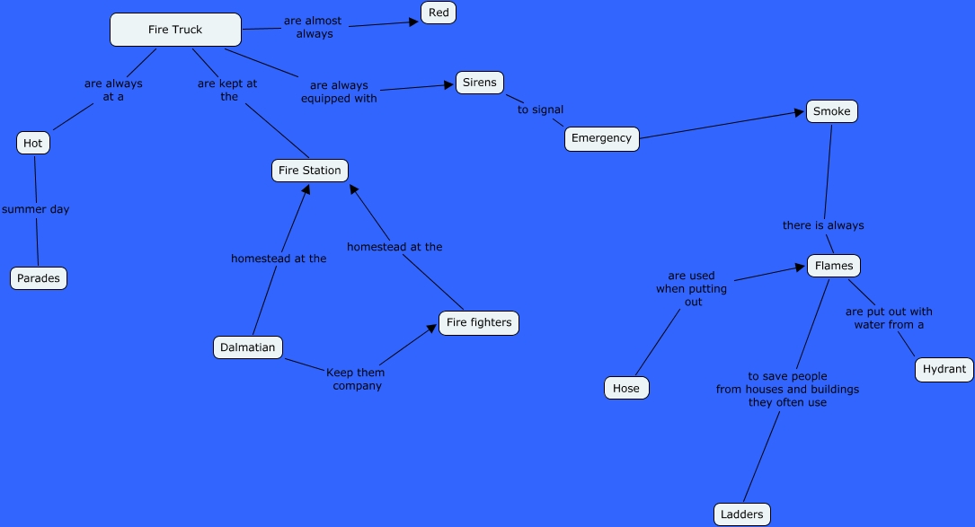 This Concept Map, created with IHMC CmapTools, has information related to: Fire Truck, Fire Truck are almost always Red, Fire Truck are kept at the Fire Station, Hot summer day Parades, Sirens to signal Emergency, Flames to save people from houses and buildings they often use Ladders, Fire Truck are always equipped with Sirens, Hose are used when putting out Flames, Fire fighters homestead at the Fire Station, Smoke there is always Flames, Flames are put out with water from a Hydrant, Dalmatian Keep them company Fire fighters, Fire Truck are always at a Hot, Dalmatian homestead at the Fire Station, Emergency ???? Smoke