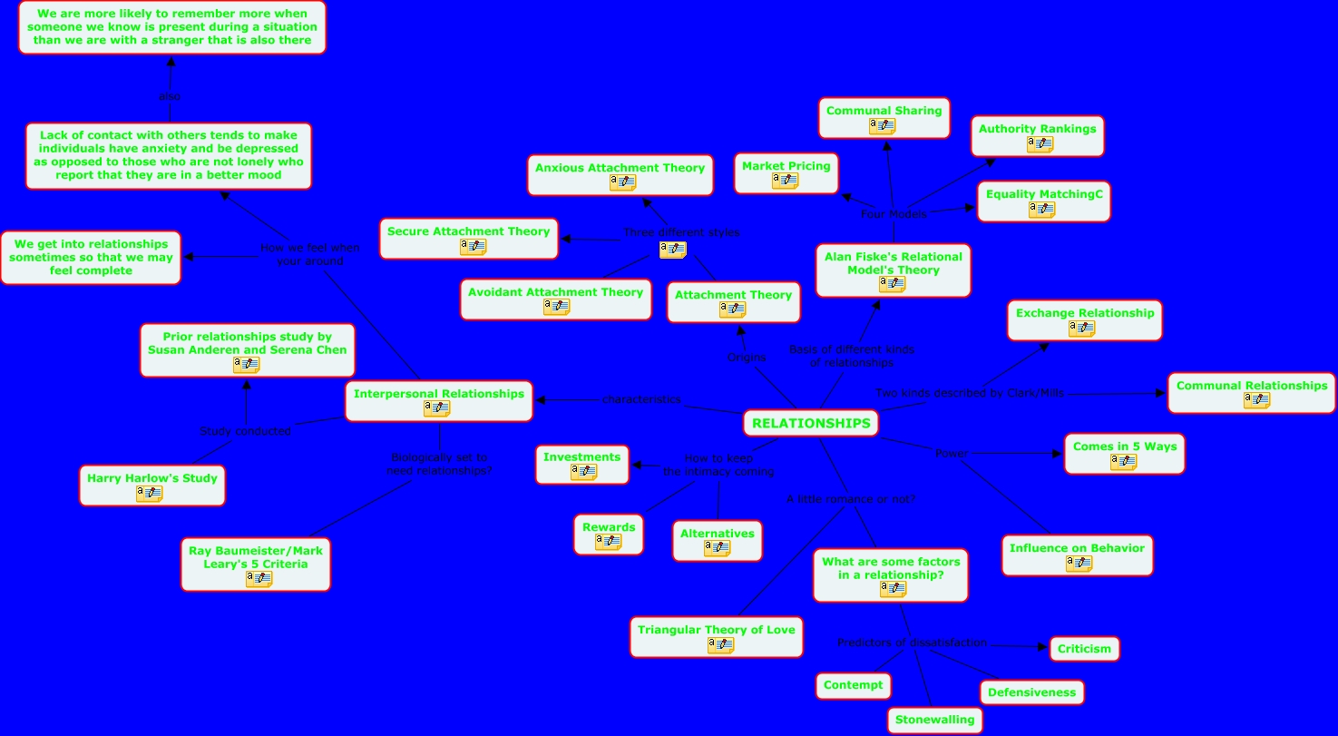 This Concept Map, created with IHMC CmapTools, has information related to: Relationships, Interpersonal Relationships Biologically set to need relationships? Ray Baumeister/Mark Leary's 5 Criteria, RELATIONSHIPS Power Comes in 5 Ways, RELATIONSHIPS Two kinds described by Clark/Mills Communal Relationships, Attachment Theory Three different styles Anxious Attachment Theory, RELATIONSHIPS A little romance or not? Triangular Theory of Love, Alan Fiske's Relational Model's Theory Four Models Authority Rankings, Interpersonal Relationships How we feel when your around We get into relationships sometimes so that we may feel complete, RELATIONSHIPS A little romance or not? What are some factors in a relationship?, RELATIONSHIPS Two kinds described by Clark/Mills Exchange Relationship, Interpersonal Relationships How we feel when your around Lack of contact with others tends to make individuals have anxiety and be depressed as opposed to those who are not lonely who report that they are in a better mood, Interpersonal Relationships Study conducted Harry Harlow's Study, Attachment Theory Three different styles Secure Attachment Theory, What are some factors in a relationship? Predictors of dissatisfaction Criticism, What are some factors in a relationship? Predictors of dissatisfaction Defensiveness, Attachment Theory Three different styles Avoidant Attachment Theory, RELATIONSHIPS How to keep the intimacy coming Alternatives, Alan Fiske's Relational Model's Theory Four Models Communal Sharing, Interpersonal Relationships Study conducted Prior relationships study by Susan Anderen and Serena Chen, Alan Fiske's Relational Model's Theory Four Models Market Pricing, RELATIONSHIPS characteristics Interpersonal Relationships