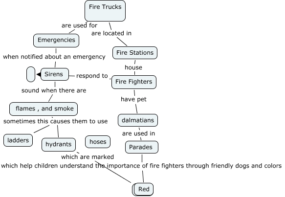 This Concept Map, created with IHMC CmapTools, has information related to: Fire Truck, flames , and smoke sometimes this causes them to use ladders, flames , and smoke sometimes this causes them to use hydrants, Fire Fighters have pet dalmatians, Fire Trucks are used for Emergencies, Fire Fighters respond to, hydrants which are marked ????, dalmatians are used in Parades, Sirens sound when there are flames , and smoke, Fire Trucks are located in Fire Stations, Parades which help children understand the importance of fire fighters through friendly dogs and colors Red, Fire Stations house Fire Fighters, Emergencies when notified about an emergency Sirens