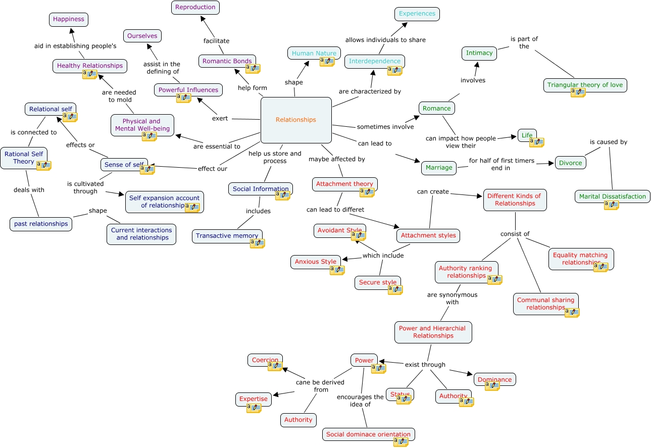 This Concept Map, created with IHMC CmapTools, has information related to: Relationships, Power cane be derived from Coercion, Power cane be derived from Authority, Relationships exert Powerful Influences, Relationships are characterized by Interdependence, Intimacy is part of the Triangular theory of love, Healthy Relationships aid in establishing people's Happiness, Marriage for half of first timers end in Divorce, Relationships sometimes involve Romance, Attachment styles which include Anxious Style, Different Kinds of Relationships consist of Authority ranking relationships, Power and Hierarchial Relationships exist through Power, Power and Hierarchial Relationships exist through Status, Powerful Influences assist in the defining of Ourselves, Relational self is connected to Rational Self Theory, Relationships are essential to Physical and Mental Well-being, Relationships effect our Sense of self, Attachment styles which include Avoidant Style, past relationships shape Current interactions and relationships, Different Kinds of Relationships consist of Communal sharing relationships, Relationships shape Human Nature