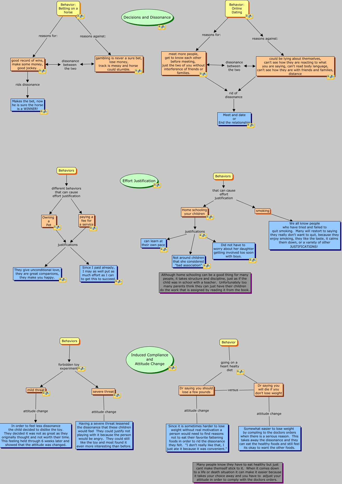 This Concept Map, created with IHMC CmapTools, has information related to: Attitudes and Behaviors, meet more people, get to know each other before meeting, just the two of you without interference of friends or families. dissonance between the two could be lying about themselves, can't see how they are reacting to what you are saying, can't read body language, can't see how they are with friends and families, distance, Behaviors forbidden toy experiment severe threat, Dr saying you will die if you don't lose weight attitude change Somewhat easier to lose weight by compling to the doctors orders when there is a serious reason. This takes away the dissonance and they can eat the healthy foods and still feel its okay to want the other foods., Home schooling your children justifications can learn at their own pace, Behavior going on a heart healty diet Dr saying you should lose a few pounds, Behaviors that can cause effort justification smoking, Owning a Pet justifications They give unconditional love, they are great companions, they make you happy., mild threat attitude change In order to feel less dissonance the child decided to dislike the toy. They decided it was not as great as they originally thought and not worth their time. This feeling held through 6 weeks later and showed that the attitude was changed., Behaviors forbidden toy experiment mild threat, Behaviors different behaviors that can cause effort justification Owning a Pet, paying a fee for a service justifications Since I paid already, I may as well put as much effort as I can to get this to succeed., Home schooling your children justifications Not around children that she considered "bad association", good record of wins, make some money, good jockey. rids dissonance Makes the bet, now he is sure the horse is a WINNER!, meet more people, get to know each other before meeting, just the two of you without interference of friends or families. rid of dissonance Meet and date or End the relationship, Behavior going on a heart healty diet Dr saying you will die if you don't lose weight, could be lying about themselves, can't see how they are reacting to what you are saying, can't read body language, can't see how they are with friends and families, distance rid of dissonance Meet and date or End the relationship, paying a fee for a service justifications They give unconditional love, they are great companions, they make you happy., Home schooling your children justifications Did not have to worry about her daughter getting involved too soon with boys., severe threat attitude change Having a severe threat lessened the dissonance that these children would feel They could justify not playing with it because the person would be angry. They could still like the toy and most found it even more interesting than before., Dr saying you should lose a few pounds attitude change Since it is sometimes harder to lose weight without real motivation a person would need to find reasons not to eat their favorite fattening foods in order to rid the dissonance they felt. "I don't really like that, I just ate it because it was convenient."