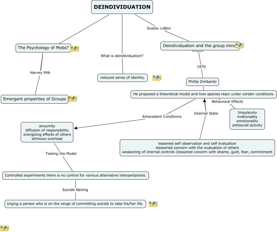 This Concept Map, created with IHMC CmapTools, has information related to: Deindividuation, ???? 1970 Phillip Zimbardo, The Psychology of Mobs? Harvey Milk Emergent properties of Groups, He proposed a theoretical model and how species react under certain conditions. Antecedent Conditions anoymity diffusion of responsibility energizing effects of others stimulus overload, Controlled experiments there is no control for various alternative interpertations. Suicide Baiting Urging a person who is on the verge of committing suicide to take his/her life., He proposed a theoretical model and how species react under certain conditions. Behavioral Effects Impulsivity irrationality emotionality antisocial activity, The Psychology of Mobs? Harvey Milk Emergent properties of Groups, DEINDIVIDUATION The Psychology of Mobs?, DEINDIVIDUATION What is deindividuation? reduced sense of identity., Phillip Zimbardo Internal State He proposed a theoretical model and how species react under certain conditions., anoymity diffusion of responsibility energizing effects of others stimulus overload Testing the Model Controlled experiments there is no control for various alternative interpertations., DEINDIVIDUATION Gustav LeBon Deindividuation and the group mind., Phillip Zimbardo Internal State lessened self observation and self evaluation lessesned concern with the evaluation of others weakening of internal controls (lessened concern with shame, guilt, fear, commitment