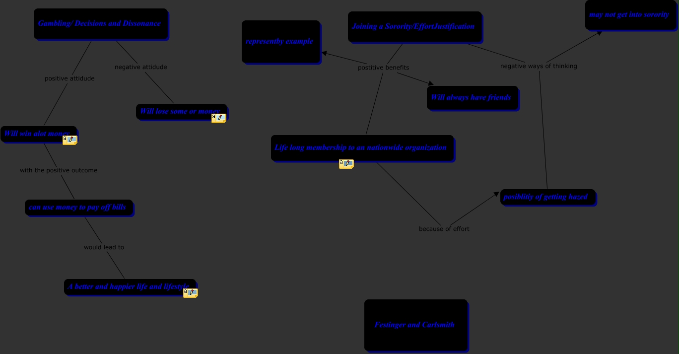 This Concept Map, created with IHMC CmapTools, has information related to: Attitudes and Behavior, can use money to pay off bills would lead to A better and happier life and lifestyle, Joining a Sorority/EffortJustification postitive benefits Life long membership to an nationwide organization, Life long membership to an nationwide organization because of effort posiblitiy of getting hazed, Joining a Sorority/EffortJustification postitive benefits Will always have friends, Joining a Sorority/EffortJustification negative ways of thinking may not get into sorority, Joining a Sorority/EffortJustification postitive benefits representby example, Joining a Sorority/EffortJustification negative ways of thinking posiblitiy of getting hazed, Will win alot money with the positive outcome can use money to pay off bills, Gambling/ Decisions and Dissonance positive attidude Will win alot money, Gambling/ Decisions and Dissonance negative attidude Will lose some or money