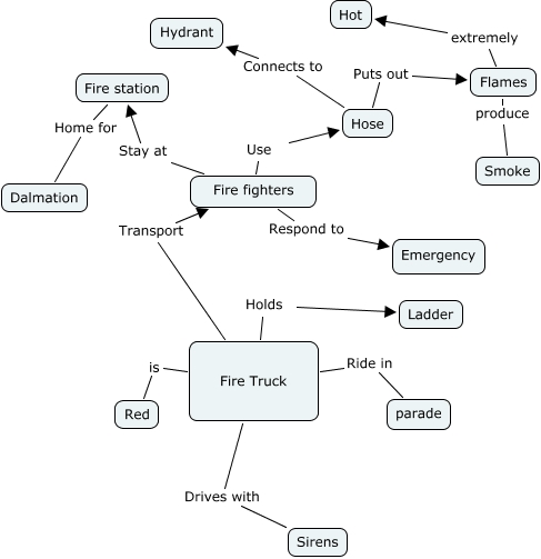 This Concept Map, created with IHMC CmapTools, has information related to: Fire Truck, Fire fighters Use Hose, Fire Truck Transport Fire fighters, Hose Puts out Flames, Hose Connects to Hydrant, Fire fighters Stay at Fire station, Flames produce Smoke, Fire Truck Ride in parade, Fire station Home for Dalmation, Flames extremely Hot, Fire fighters Respond to Emergency, Fire Truck Holds Ladder, Fire Truck Drives with Sirens, Fire Truck is Red
