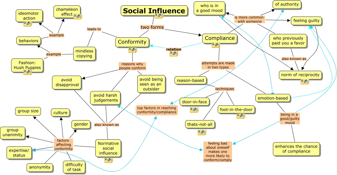 This Concept Map, created with IHMC CmapTools, has information related to: Social Influence, Conformity reasons why people conform avoid harsh judgements, emotion-based being in a good/guilty mood enhances the chance of compliance, Social Influence two forms Compliance, Normative social influence factors affecting conformity anonymity, avoid being seen as an outsider also known as Normative social influence, Compliance is more common with someone who previously paid you a favor, Conformity reasons why people conform avoid disapproval, Conformity leads to mindless copying, avoid harsh judgements feeling bad about oneself makes one more likely to conform/comply feeling guilty, Normative social influence factors affecting conformity group size, Normative social influence factors affecting conformity difficulty of task, Compliance is more common with someone of authority, reason-based techniques thats-not-all, Social Influence two forms Conformity, Compliance is more common with someone feeling guilty, reason-based techniques foot-in-the-door, who is in a good mood ???? emotion-based, Normative social influence factors affecting conformity expertise/ status, of authority top factors in reaching conformity/compliance expertise/ status, who previously paid you a favor also known as norm of reciprocity