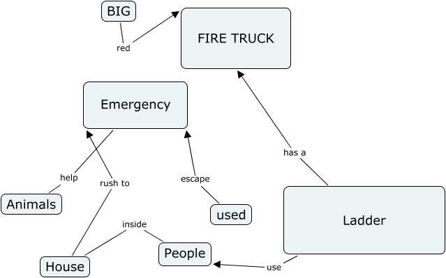 This Concept Map, created with IHMC CmapTools, has information related to: Fire Truck, Ladder has a FIRE TRUCK, Ladder use People, People inside House, Emergency help Animals, BIG red FIRE TRUCK, House rush to Emergency, used escape Emergency