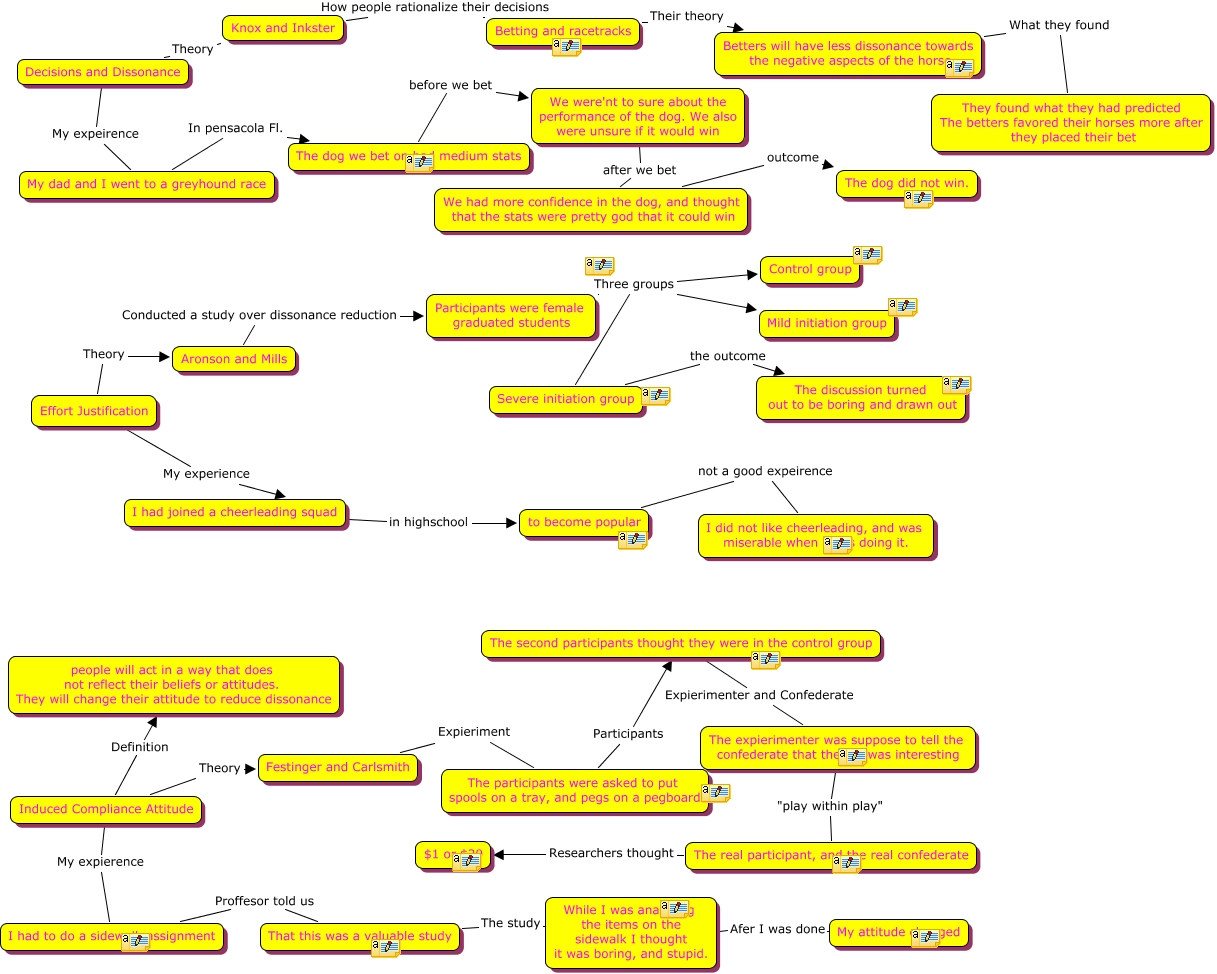 This Concept Map, created with IHMC CmapTools, has information related to: Attitudes and Behavior, Participants were female graduated students Three groups Control group, Effort Justification Theory Aronson and Mills, The second participants thought they were in the control group Expierimenter and Confederate The expierimenter was suppose to tell the confederate that the job was interesting, We had more confidence in the dog, and thought that the stats were pretty god that it could win outcome The dog did not win., I had joined a cheerleading squad in highschool to become popular, That this was a valuable study The study While I was analyzing the items on the sidewalk I thought it was boring, and stupid., Betters will have less dissonance towards the negative aspects of the horse What they found They found what they had predicted The betters favored their horses more after they placed their bet, Decisions and Dissonance Theory Knox and Inkster, Knox and Inkster How people rationalize their decisions Betting and racetracks, Induced Compliance Attitude My expierence I had to do a sidewalk assignment, Induced Compliance Attitude Definition people will act in a way that does not reflect their beliefs or attitudes. They will change their attitude to reduce dissonance, Effort Justification My experience I had joined a cheerleading squad, My dad and I went to a greyhound race In pensacola Fl. The dog we bet on had medium stats, The dog we bet on had medium stats before we bet We were'nt to sure about the performance of the dog. We also were unsure if it would win, The participants were asked to put spools on a tray, and pegs on a pegboard Participants The second participants thought they were in the control group, Decisions and Dissonance My expeirence My dad and I went to a greyhound race, I had to do a sidewalk assignment Proffesor told us That this was a valuable study, to become popular not a good expeirence I did not like cheerleading, and was miserable when I was doing it., While I was analyzing the items on the sidewalk I thought it was boring, and stupid. Afer I was done My attitude changed, The expierimenter was suppose to tell the confederate that the job was interesting "play within play" The real participant, and the real confederate