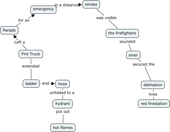 This Concept Map, created with IHMC CmapTools, has information related to: Fire Truck, Parade for an emergency, smoke was visible the firefighters, Fire Truck extended ladder, siren secured the dalmation, ladder and hose, emergency in a distance smoke, Fire Truck Left a Parade, the firefighters sounded siren, dalmation lives red firestation, hose unfolded to a hydrant, hydrant put out hot flames
