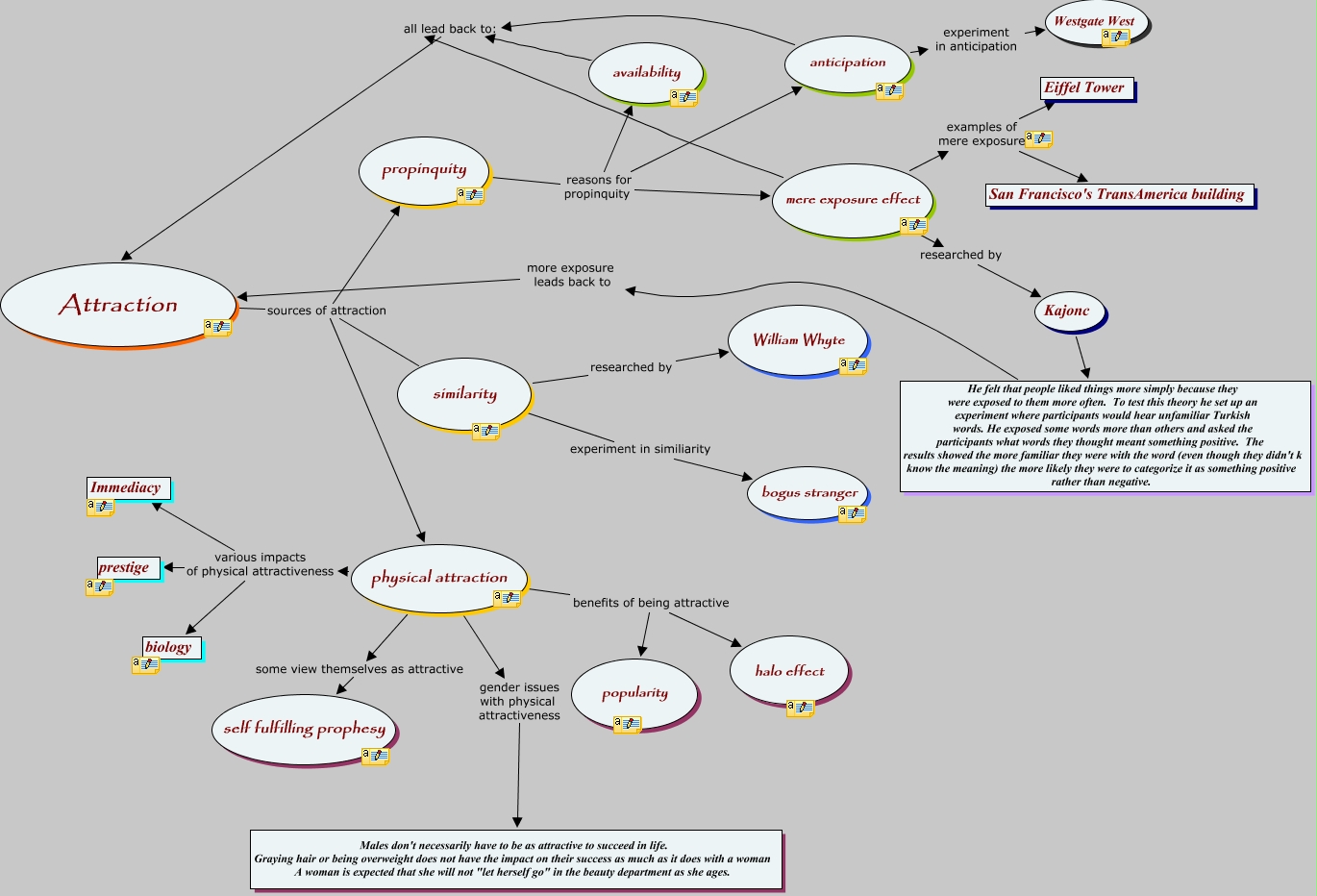 This Concept Map, created with IHMC CmapTools, has information related to: Attraction, physical attraction various impacts of physical attractiveness prestige, mere exposure effect examples of mere exposure San Francisco's TransAmerica building, propinquity reasons for propinquity mere exposure effect, Attraction sources of attraction propinquity, mere exposure effect examples of mere exposure Eiffel Tower, propinquity reasons for propinquity availability, physical attraction gender issues with physical attractiveness Males don't necessarily have to be as attractive to succeed in life. Graying hair or being overweight does not have the impact on their success as much as it does with a woman A woman is expected that she will not "let herself go" in the beauty department as she ages., physical attraction some view themselves as attractive self fulfilling prophesy, Kajonc ???? He felt that people liked things more simply because they were exposed to them more often. To test this theory he set up an experiment where participants would hear unfamiliar Turkish words. He exposed some words more than others and asked the participants what words they thought meant something positive. The results showed the more familiar they were with the word (even though they didn't k know the meaning) the more likely they were to categorize it as something positive rather than negative., physical attraction various impacts of physical attractiveness Immediacy, anticipation experiment in anticipation Westgate West, similarity researched by William Whyte, availability all lead back to: Attraction, mere exposure effect researched by Kajonc, mere exposure effect all lead back to: Attraction, Attraction sources of attraction similarity, physical attraction benefits of being attractive popularity, physical attraction various impacts of physical attractiveness biology, physical attraction benefits of being attractive halo effect, anticipation all lead back to: Attraction