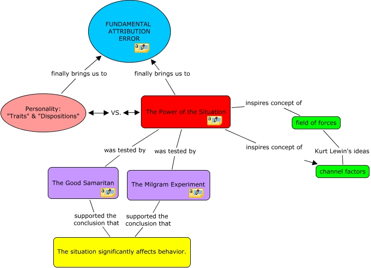 This Concept Map, created with IHMC CmapTools, has information related to: The Power of the Situation, Personality: "Traits" & "Dispositions" finally brings us to FUNDAMENTAL ATTRIBUTION ERROR, The Power of the Situation was tested by The Good Samaritan, field of forces Kurt Lewin's ideas channel factors, The Milgram Experiment supported the conclusion that The situation significantly affects behavior., The Good Samaritan supported the conclusion that The situation significantly affects behavior., Personality: "Traits" & "Dispositions" VS. The Power of the Situation, The Power of the Situation was tested by The Milgram Experiment, The Power of the Situation finally brings us to FUNDAMENTAL ATTRIBUTION ERROR, The Power of the Situation inspires concept of channel factors, The Power of the Situation inspires concept of field of forces