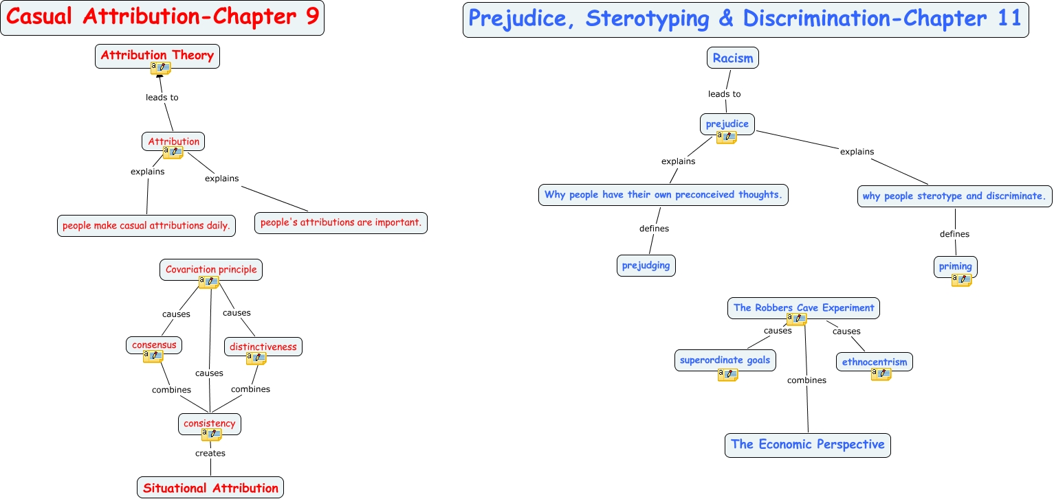 This Concept Map, created with IHMC CmapTools, has information related to: Final, The Robbers Cave Experiment causes ethnocentrism, The Robbers Cave Experiment causes superordinate goals, consistency creates Situational Attribution, distinctiveness combines consistency, why people sterotype and discriminate. defines priming, Why people have their own preconceived thoughts. defines prejudging, Attribution explains people's attributions are important., Covariation principle causes distinctiveness, prejudice explains Why people have their own preconceived thoughts., Racism leads to prejudice, The Robbers Cave Experiment combines The Economic Perspective, consensus combines consistency, Attribution explains people make casual attributions daily., Covariation principle causes consensus, Covariation principle causes consistency, prejudice explains why people sterotype and discriminate.