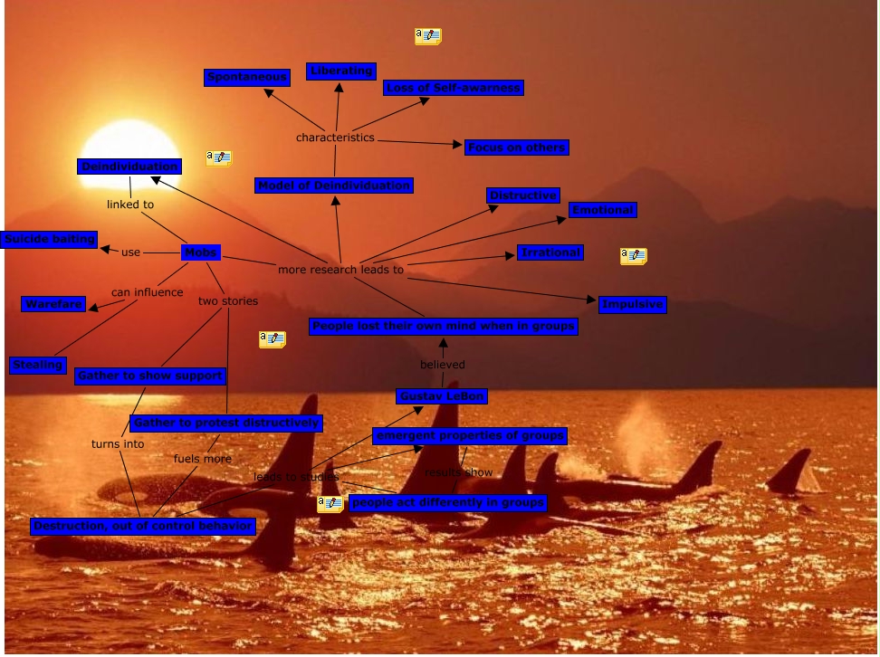 This Concept Map, created with IHMC CmapTools, has information related to: Deindividuation, Model of Deindividuation characteristics Spontaneous, Mobs more research leads to Distructive, People lost their own mind when in groups more research leads to Model of Deindividuation, Gather to show support turns into Destruction, out of control behavior, People lost their own mind when in groups more research leads to Distructive, people act differently in groups leads to studies Gustav LeBon, Mobs more research leads to Deindividuation, Model of Deindividuation characteristics Focus on others, Model of Deindividuation characteristics Loss of Self-awarness, Mobs more research leads to Emotional, Model of Deindividuation characteristics Liberating, Deindividuation linked to Mobs, Destruction, out of control behavior leads to studies emergent properties of groups, Mobs two stories Gather to show support, Destruction, out of control behavior leads to studies Gustav LeBon, Mobs can influence Stealing, Mobs more research leads to Impulsive, Mobs can influence Warefare, People lost their own mind when in groups more research leads to Irrational, Mobs more research leads to Irrational