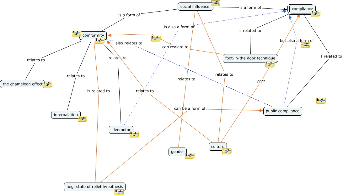 This Concept Map, created with IHMC CmapTools, has information related to: Social Influence, social influence is a form of comformity, foot-in-the door technique can realate to ????, comformity relates to the chameleon effect, comformity relates to ideomotor, social influence is a form of compliance, neg. state of relief hypothesis can be a form of ????, public compliance also relates to ????, public compliance but also a form of compliance, compliance is related to foot-in-the door technique, compliance is related to public compliance, culture ???? compliance, comformity relates to internalation, ideomotor is also a form of compliance, comformity is related to neg. state of relief hypothesis, social influence relates to culture, social influence relates to gender, culture relates to comformity