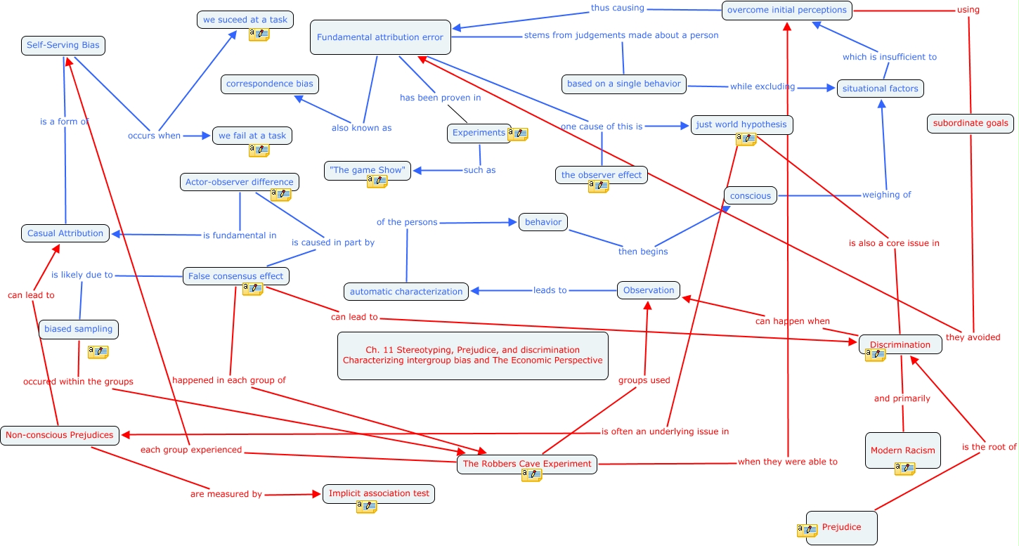 This Concept Map, created with IHMC CmapTools, has information related to: Final, The Robbers Cave Experiment when they were able to overcome initial perceptions, Discrimination and primarily Modern Racism, The Robbers Cave Experiment groups used Observation, based on a single behavior while excluding situational factors, subordinate goals they avoided Fundamental attribution error, Fundamental attribution error one cause of this is the observer effect, Non-conscious Prejudices are measured by Implicit association test, Experiments such as "The game Show", overcome initial perceptions thus causing Fundamental attribution error, False consensus effect happened in each group of The Robbers Cave Experiment, Actor-observer difference is fundamental in Casual Attribution, just world hypothesis is often an underlying issue in Non-conscious Prejudices, Fundamental attribution error stems from judgements made about a person based on a single behavior, Self-Serving Bias occurs when we suceed at a task, Fundamental attribution error has been proven in Experiments, Discrimination can happen when Observation, Fundamental attribution error also known as correspondence bias, behavior then begins conscious, False consensus effect is likely due to biased sampling, biased sampling occured within the groups The Robbers Cave Experiment