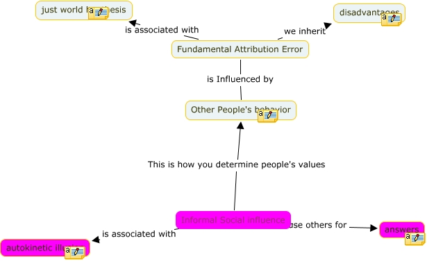This Concept Map, created with IHMC CmapTools, has information related to: Final, Fundamental Attribution Error is associated with just world hpothesis, Informal Social influence is associated with autokinetic illusion, Informal Social influence use others for answers, Informal Social influence This is how you determine people's values Other People's behavior, Fundamental Attribution Error we inherit disadvantages, Fundamental Attribution Error is Influenced by Other People's behavior