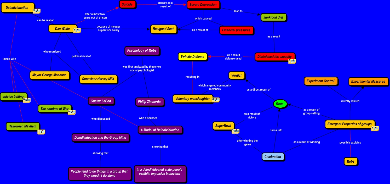 This Concept Map, created with IHMC CmapTools, has information related to: Deindividuation, Psychology of Mobs was first analyzed by these two social psychologist Philip Zimbardo, Severe Depression which caused Financial pressures, Diminished his capacity as a result defense used Twinkie Defense, Suicide probaly as a result of Severe Depression, Deindividuation tested with The conduct of War, Twinkie Defense resulting in Voluntary manslaughter, Dan White after almost two years out of prison Suicide, Experiment Control directly related Emergent Properties of groups, Deindividuation tested with A Model of Deindividuation, Emergent Properties of groups possibly explains Mobs, A Model of Deindividuation showing that In a deindividuated state people exhibits impulsive behaviors, Riots as a direct result of Verdict, Dan White who murdered Mayor George Moscone, Emergent Properties of groups as a result of winning Celebration, Gustav LaBon who discussed Deindividuation and the Group Mind, SuperBowl after winning the game Celebration, Severe Depression which caused Resigned Seat, Deindividuation tested with suicide baiting, Junkfood diet as a result Diminished his capacity, Emergent Properties of groups as a result of group setting Riots