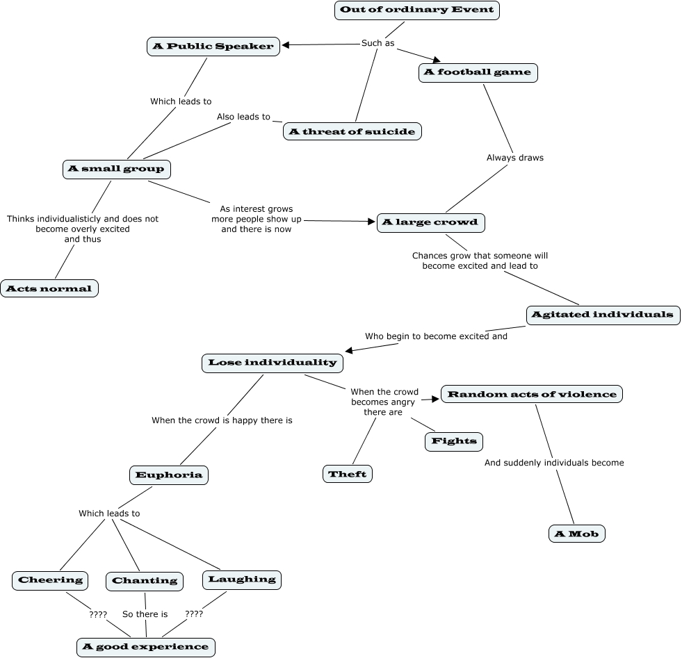 This Concept Map, created with IHMC CmapTools, has information related to: Mob, Out of ordinary Event Such as A threat of suicide, A small group Thinks individualisticly and does not become overly excited and thus Acts normal, A threat of suicide Also leads to A small group, A Public Speaker Which leads to A small group, Lose individuality When the crowd becomes angry there are Random acts of violence, Euphoria Which leads to Cheering, Euphoria Which leads to Laughing, Chanting So there is A good experience, Agitated individuals Who begin to become excited and Lose individuality, Laughing ???? A good experience, Euphoria Which leads to Chanting, A small group As interest grows more people show up and there is now A large crowd, Lose individuality When the crowd becomes angry there are Theft, Cheering ???? A good experience, Lose individuality When the crowd becomes angry there are Fights, Random acts of violence And suddenly individuals become A Mob, A large crowd Chances grow that someone will become excited and lead to Agitated individuals, Lose individuality When the crowd is happy there is Euphoria, A football game Always draws A large crowd, Out of ordinary Event Such as A football game
