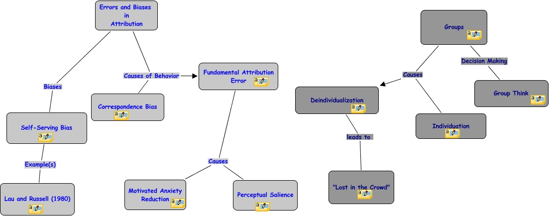 This Concept Map, created with IHMC CmapTools, has information related to: Final, Groups Decision Making Group Think, Groups Causes Individuation, Errors and Biases in Attribution Causes of Behavior Correspondence Bias, Fundamental Attribution Error Causes Motivated Anxiety Reduction, Fundamental Attribution Error Causes Perceptual Salience, Errors and Biases in Attribution Causes of Behavior Fundamental Attribution Error, Deindividualization leads to "Lost in the Crowd", Groups Causes Deindividualization, Errors and Biases in Attribution Biases Self-Serving Bias, Self-Serving Bias Example(s) Lau and Russell (1980)