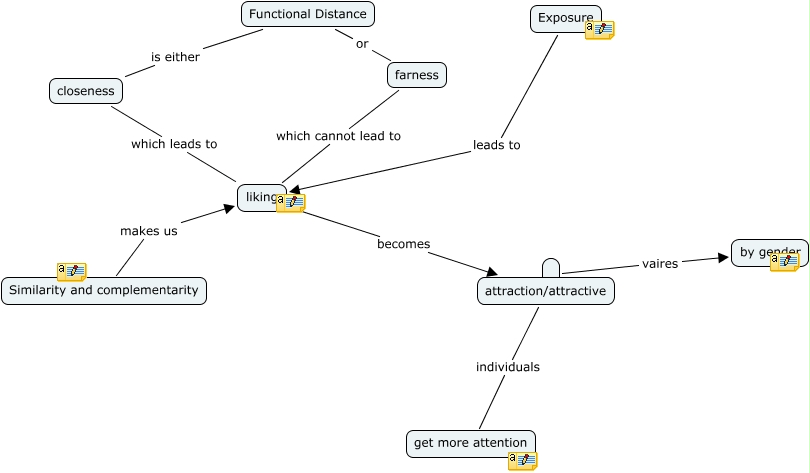 This Concept Map, created with IHMC CmapTools, has information related to: Attraction, Functional Distance is either closeness, liking becomes attraction/attractive, Functional Distance or farness, closeness which leads to liking, farness which cannot lead to liking, attraction/attractive individuals get more attention, vaires by gender, Similarity and complementarity makes us liking, Exposure leads to liking