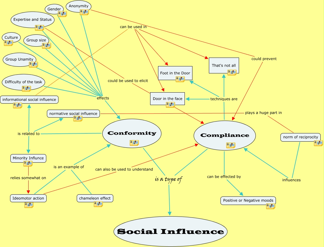 This Concept Map, created with IHMC CmapTools, has information related to: Social Influence, Minority Influnce relies somewhat on Ideomotor action, Compliance can be effected by Positive or Negative moods, Difficulty of the task effects Conformity, chameleon effect is an example of Conformity, Compliance is a type of Social Influence, Group Unamity effects Conformity, informational social influence can be used in Foot in the Door, Group size effects Conformity, Anonymity effects Conformity, Conformity is a type of Social Influence, Culture effects Conformity, Compliance techniques are Foot in the Door, Expertise and Status effects Conformity, informational social influence can be used in That's not all, Gender effects Conformity, Ideomotor action is an example of Conformity, Expertise and Status could be used to elicit Compliance, normative social influence plays a huge part in norm of reciprocity, Conformity is related to informational social influence, Anonymity could prevent Compliance